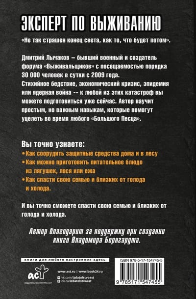 Дмитрий Лычаков – бывший военный и создатель форума «Выживальщиков» c посещаемостью порядка 30 000 человек в сутки с 2009 года. Стихийное бедствие, экономический кризис, эпидемия или ядерная война -- к любой из этих катастроф вы можете подготовиться уже сейчас. Автор научит простым, но важным навыкам, которые помогут уцелеть во время любого «Большого Песца».
