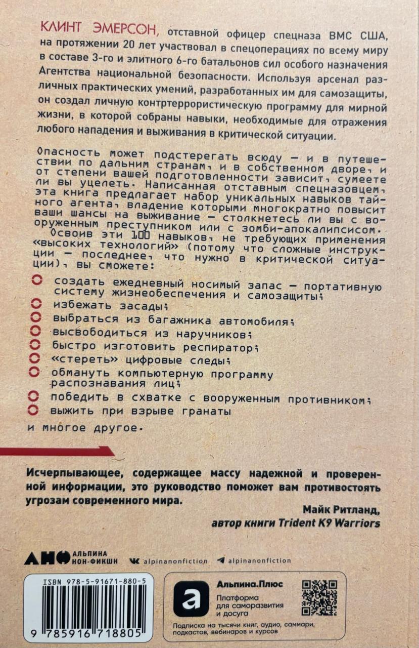 Клинт Эмерсон, отставной офицер ВМФ, несколько лет прослуживший в Агентстве национальной безопасности, основывается на своем обширном опыте, который включает 20 лет участия в спецоперациях по всему миру, в составе группы и в одиночку, и соединяет навыки разведчика и бойца. Знания и умения, описанные в книге, дают возможность выстоять в любых переделках: вы узнаете, как уходить от слежки, вырываться из рук похитителей, противостоять нападению. Это одновременно и практическое пособие, и захватывающее чтение, приоткрывающее завесу тайны над жизнью агентов спецслужб.