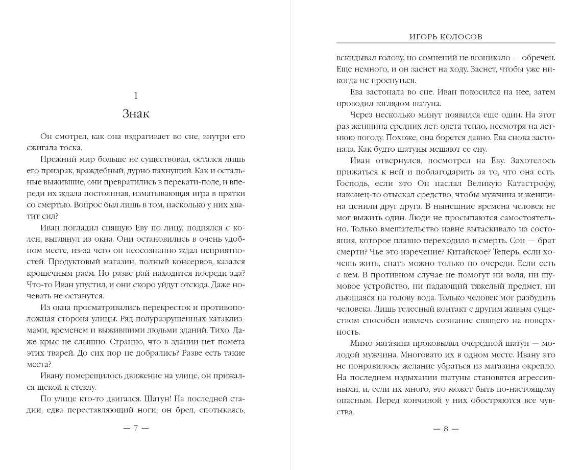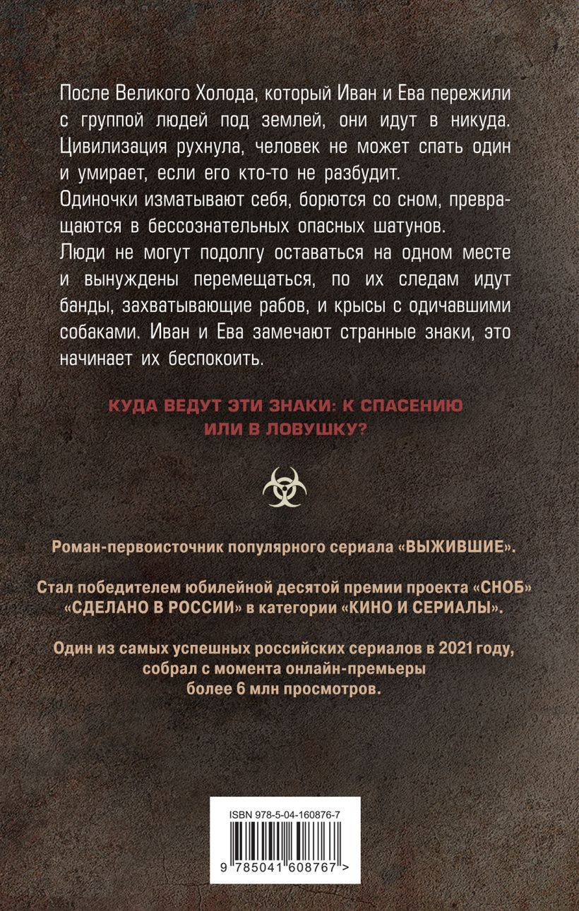 После Великого Холода, который Иван и Ева пережили с группой людей под землей, они идут в никуда. Цивилизация рухнула, человек не может спать один и умирает, Если его кто-то не разбудит. Одиночки изматывают себя, борются со сном, превращаются в бессознательных опасных шатунов. Люди не могут подолгу оставаться на одном месте и вынуждены перемещаться по их следам идут банды, захватывающие рабов и крысы с одичавшими собаками. Иван и Ева замечают странные знаки, это начинает их беспокоить. Куда ведут знаки: к спасению или в ловушку?
