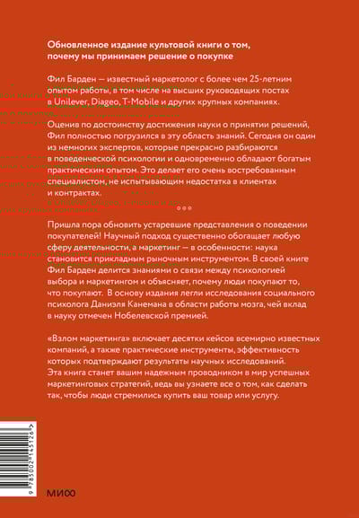 Пришла пора обновить устаревшие представления о поведении покупателей! Научный подход существенно обогащает любую сферу деятельности, а маркетинг – в особенности: наука становится прикладным рыночным инструментом. В своей книге Фил Барден делится знаниями о связи между психологией выбора и маркетингом и объясняет, почему люди покупают то, что покупают. В основу книги легли исследования о работе мозга социального психолога Даниэля Канемана, чей вклад в науку отмечен Нобелевской премией.