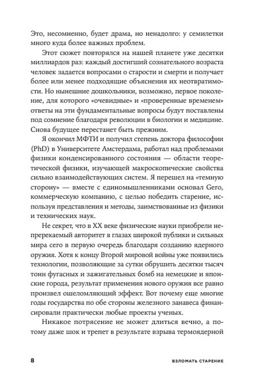 Из книги Петра Федичева, доктора философии (Ph. D.), российского биофизика, основателя и научного директора биотех‑компании Gero, читатель узнает, какие способы борьбы со старостью и смертью пыталось изобрести человечество на протяжении истории и почему в XXI веке мы впервые получили шанс на успех.