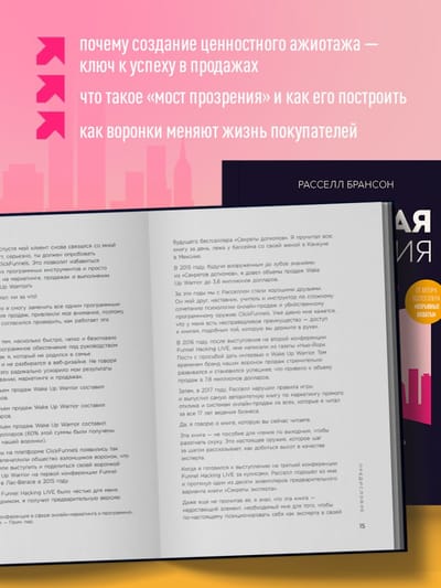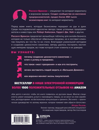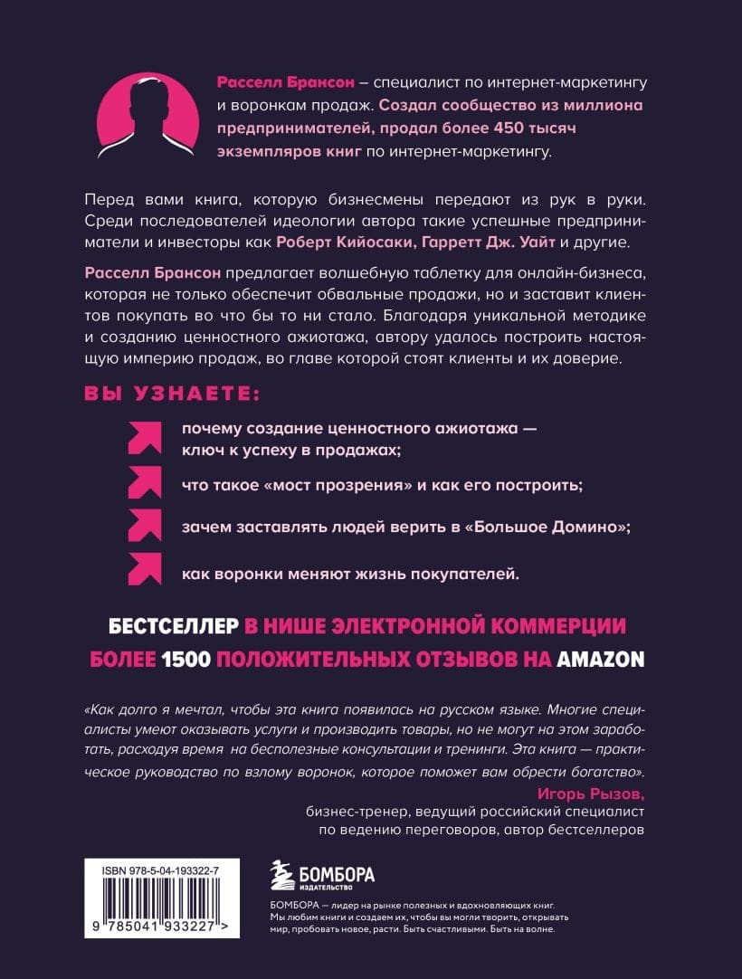 Расселл Брансон — специалист по интернет-маркетингу и воронкам продаж. Создал сообщество из миллиона предпринимателей, продал более 450 тысяч экземпляров книг по интернет-маркетингу. Автор предлагает волшебную таблетку для онлайн-бизнеса, которая обеспечит не только обвальные продажи, но и заставит клиентов покупать во что бы то ни стало. Благодаря уникальной методике и созданию ценностного ажиотажа автору удалось построить настоящую империю продаж, во главе которой стоят клиенты и их доверие.