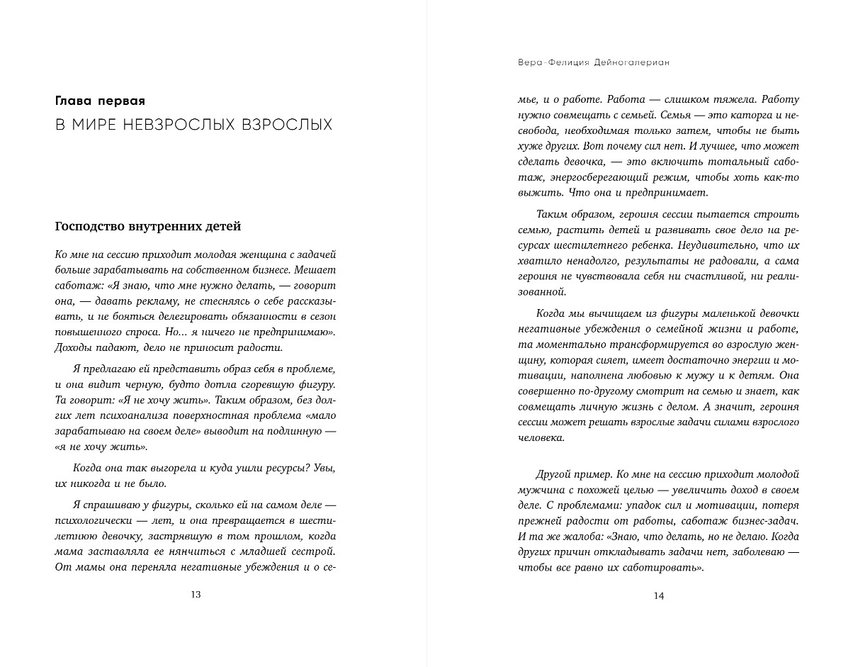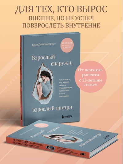 Психотерапевт Вера Дейногалериан утверждает: «Пока наш внутренний ребенок обижен, недолюблен и напуган, его бесполезно баловать, — его нужно спасать». В этой книге Вера предлагает нам изучить язык бессознательного, чтобы встретиться лицом к лицу со своей болью и исцелить ее. Здесь не будет медитаций, волшебства и аффирмаций. Только практичные инструменты, благодаря которым сотни клиентов обрели психологическую зрелость и наконец стали хозяевами своей жизни.