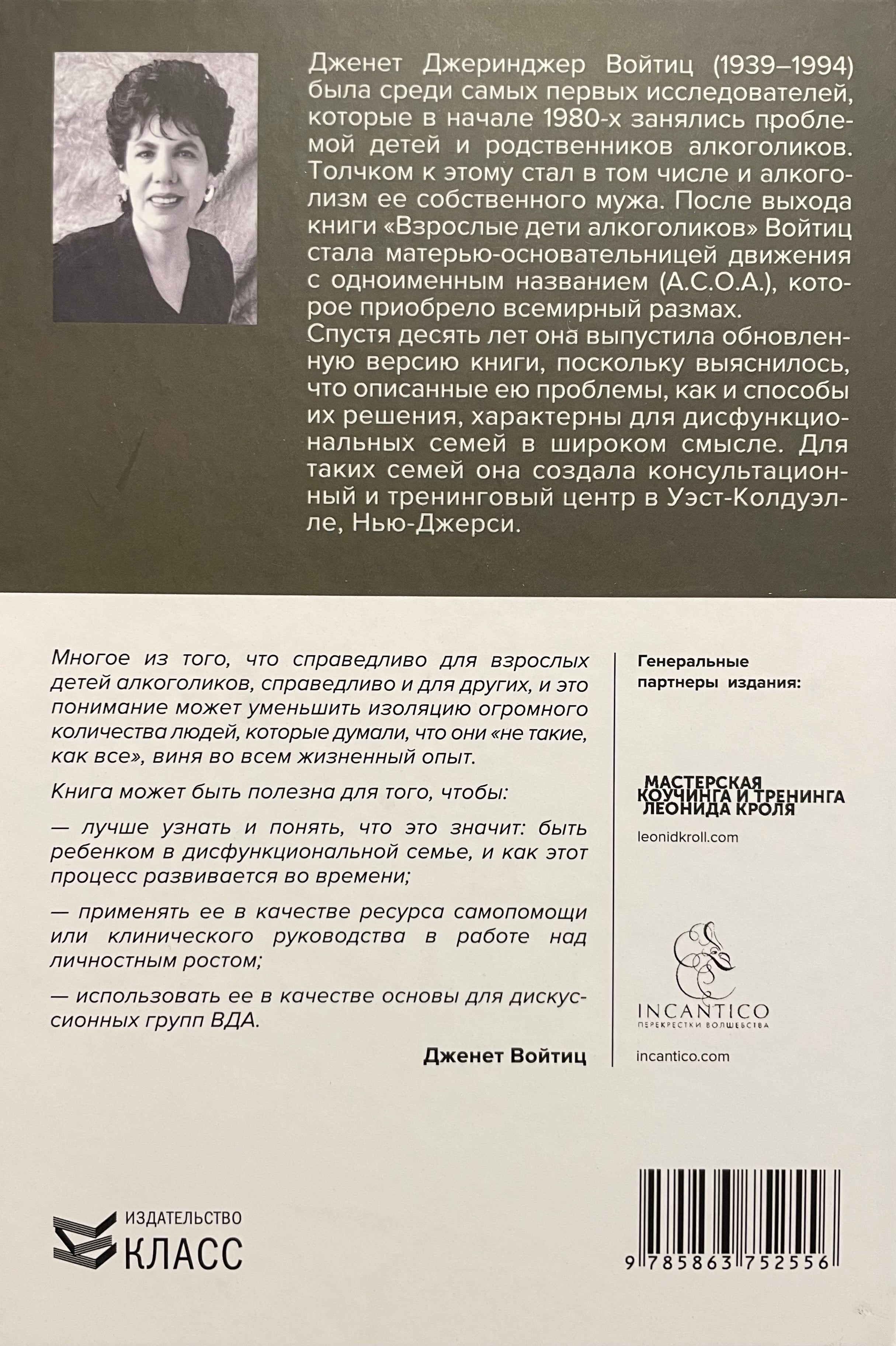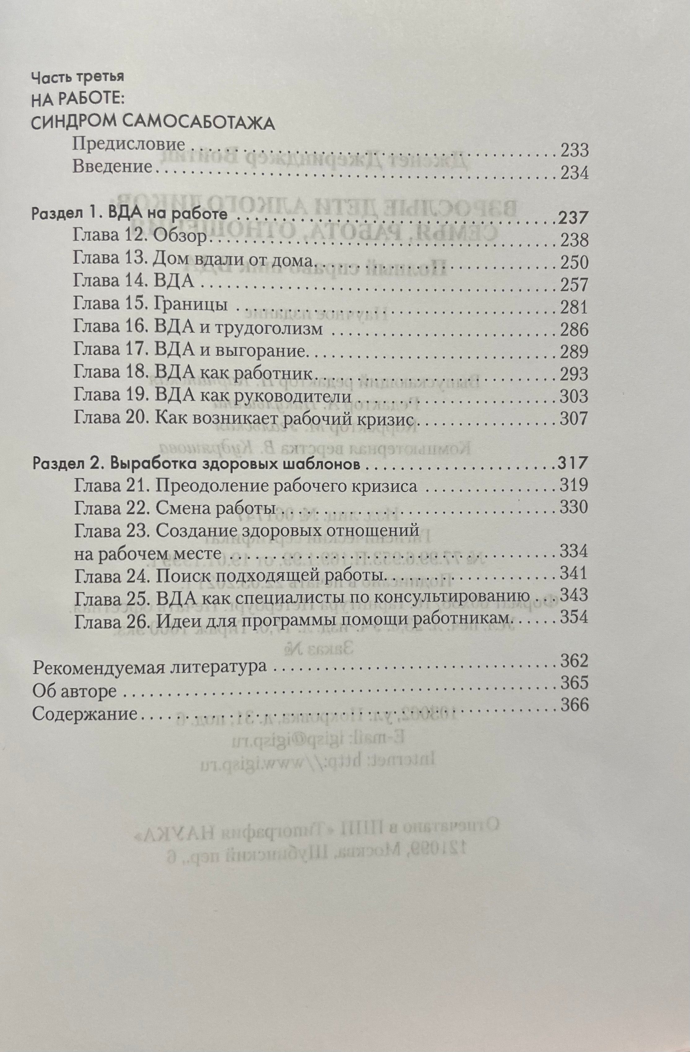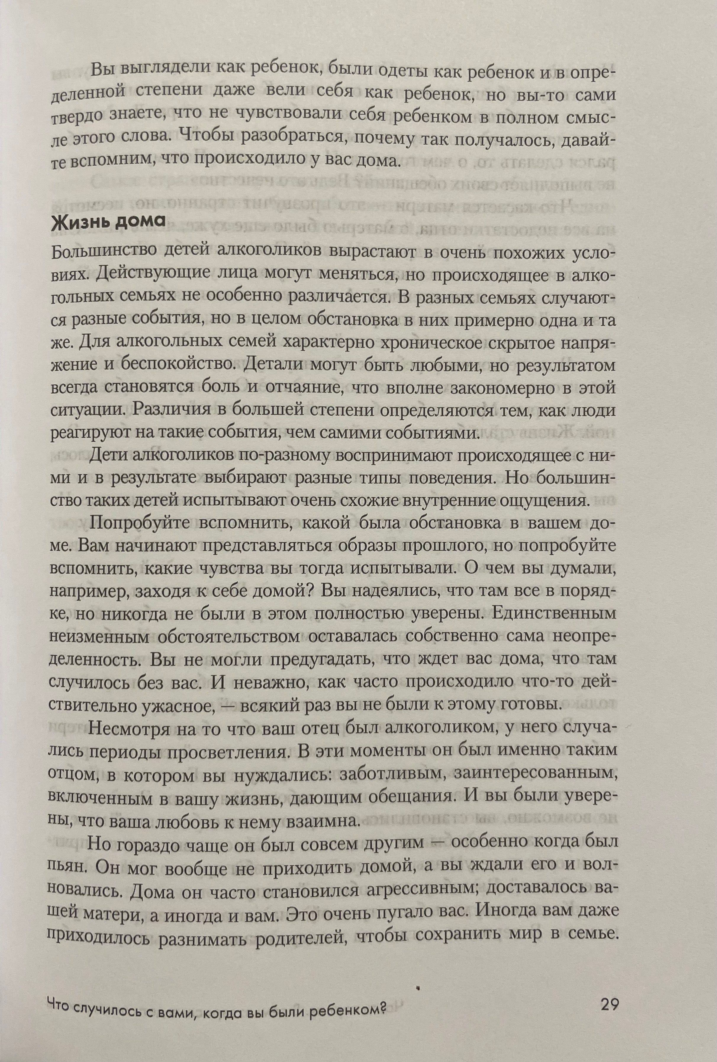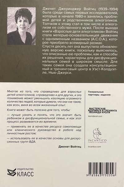 Эта книга, будучи впервые опубликованной еще в 80-х годах прошлого века, до сих пор остается фундаментальной работой, наиболее полно рассматривающей проблемы, с которыми сталкиваются ВДА. Она может быть использована в работе психотерапевтов, а также как источник информации для самопомощи всем, чья жизнь подверглась влиянию дисфункциональных отношений в семье.