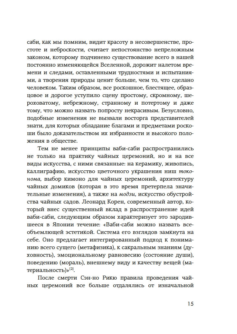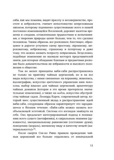 Ничто не вечно, ничто не законченно и ничто не совершенно. Воплощая в себе глубокую мудрость дзен-буддизма, японская концепция ваби-саби дарит новый взгляд на мир, красоту, мораль и образ жизни, позволяя вырваться из плена общепринятых представлений о «благополучии» и отвести взгляд от ложных целей, обратив его к главному. Эта книга окажет неоценимую услугу каждому, кто желает раскрепоститься и переосмыслить свою жизнь, поставив во главу природное, а не возделанное, естественное, а не искусственное, незначительное, а не символичное, шероховатое, а не гладкое, непредвиденное, а не предусмотренное… Отдохните душой в прохладной тени идей, изложенных на страницах этой книги, чтобы сделать глоток свежего воздуха в душном мире соперничества, расчета, приобретательства, гонки за достижениями. Оцените прелесть минимализма и сдержанности, неправильных форм и незавершенности, чтобы сделать первый шаг на пути к принятию несовершенства всего сущего и осознанию величия бесконечности.