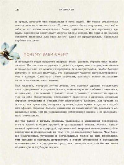Ваби-саби – это альтернатива современному ритму жизни и ценностям, основанным на потреблении и стремлении к идеалу. Видеть красоту в несовершенстве, ценить простоту и радость момента, ощущать связь с природой и принимать мимолетность жизни, отбросить лишнее и сосредоточиться на важном – основные принципы этой вневременной концепции. Эта книга – предложение расслабиться и ощутить красоту собственного бытия в каждом моменте, избавить его от всего напускного и открыть то, что внутри. Впустите ваби-саби в свою жизнь и найдите счастье прямо там, где вы находитесь.