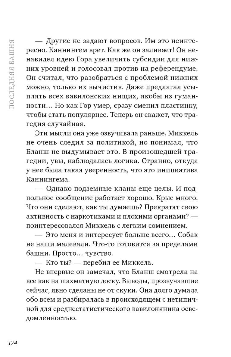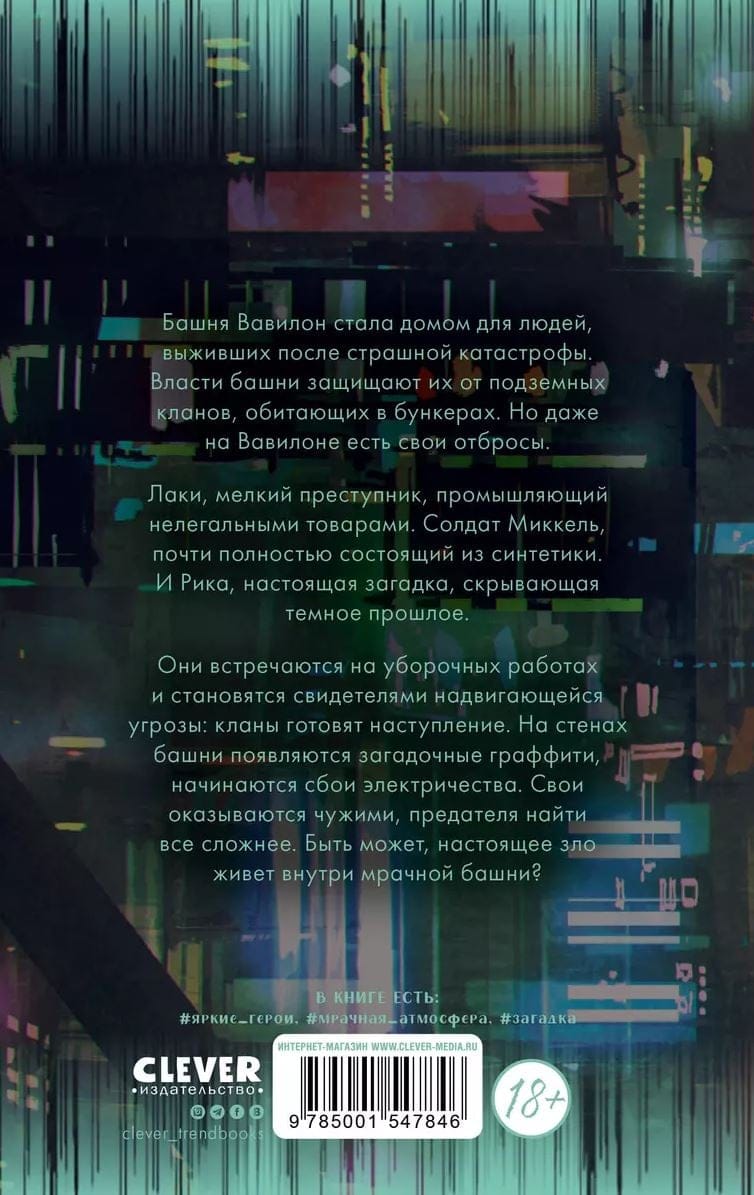 Башня Вавилон стала домом для людей, выживших после страшной катастрофы. Власти башни защищают их от подземных кланов, обитающих в бункерах. Но даже на Вавилоне есть свои отбросы. Лаки, мелкий преступник, промышляющий нелегальными товарами. Солдат Миккель, почти полностью состоящий из синтетики. И Рика, настоящая загадка, скрывающая темное прошлое. Они встречаются на уборочных работах и становятся свидетелями надвигающейся угрозы кланы готовят наступление. На стенах башни появляются загадочные граффити, начинаются сбои электричества. Свои оказываются чужими, предателя найти все сложнее. Быть может, настоящее зло живет внутри мрачной башни? В КНИГЕ ЕСТЬ #яркие_герои, #мрачная_атмосфера, #загадка?