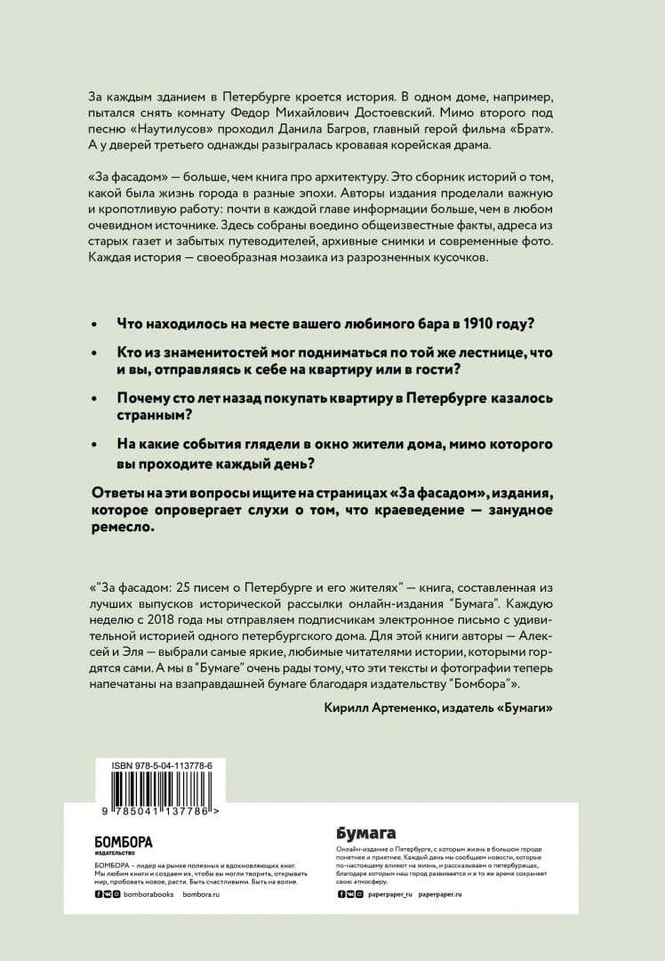 "За фасадом: 25 писем о Петербурге и его жителях" – больше, чем книга про архитектуру. Это сборник историй о том, какой была жизнь города в разные эпохи. Авторы издания, Алексей Шишкин и Эля Новопашенная, доказывают, что современное краеведение – это вовсе не скучно. Ведь за парадными фасадами скрываются самые удивительные сюжеты.