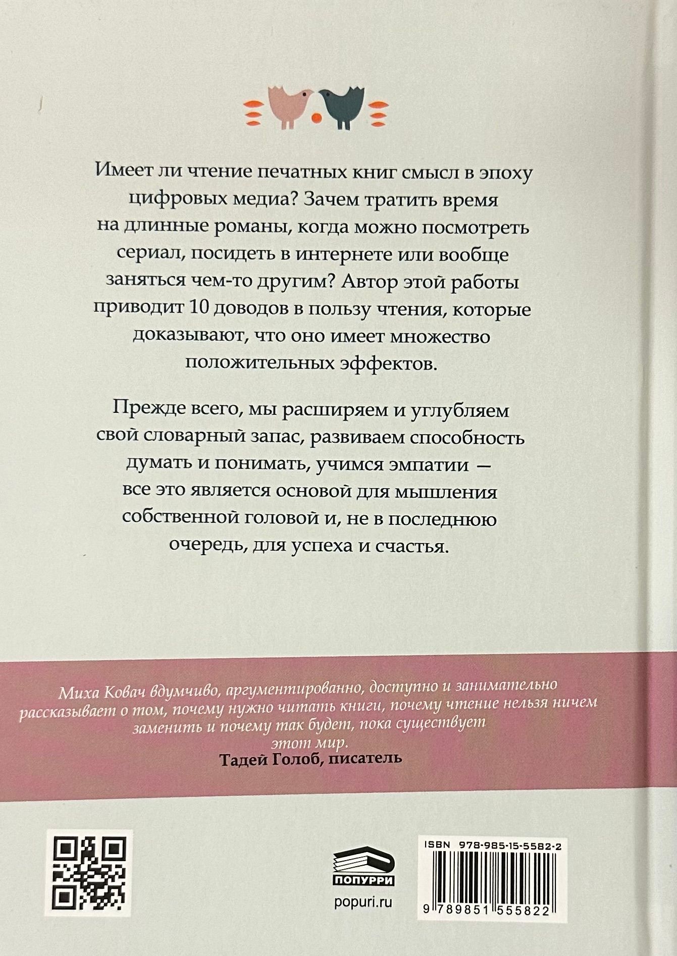Имеет ли чтение печатных книг смысл в эпоху цифровых медиа? Зачем тратить время на длинные романы, когда можно посмотреть сериал, посидеть в интернете или вообще заняться чем-то другим? Автор этой работы приводит 10 доводов в пользу чтения, которые доказывают, что оно имеет множество положительных эффектов.