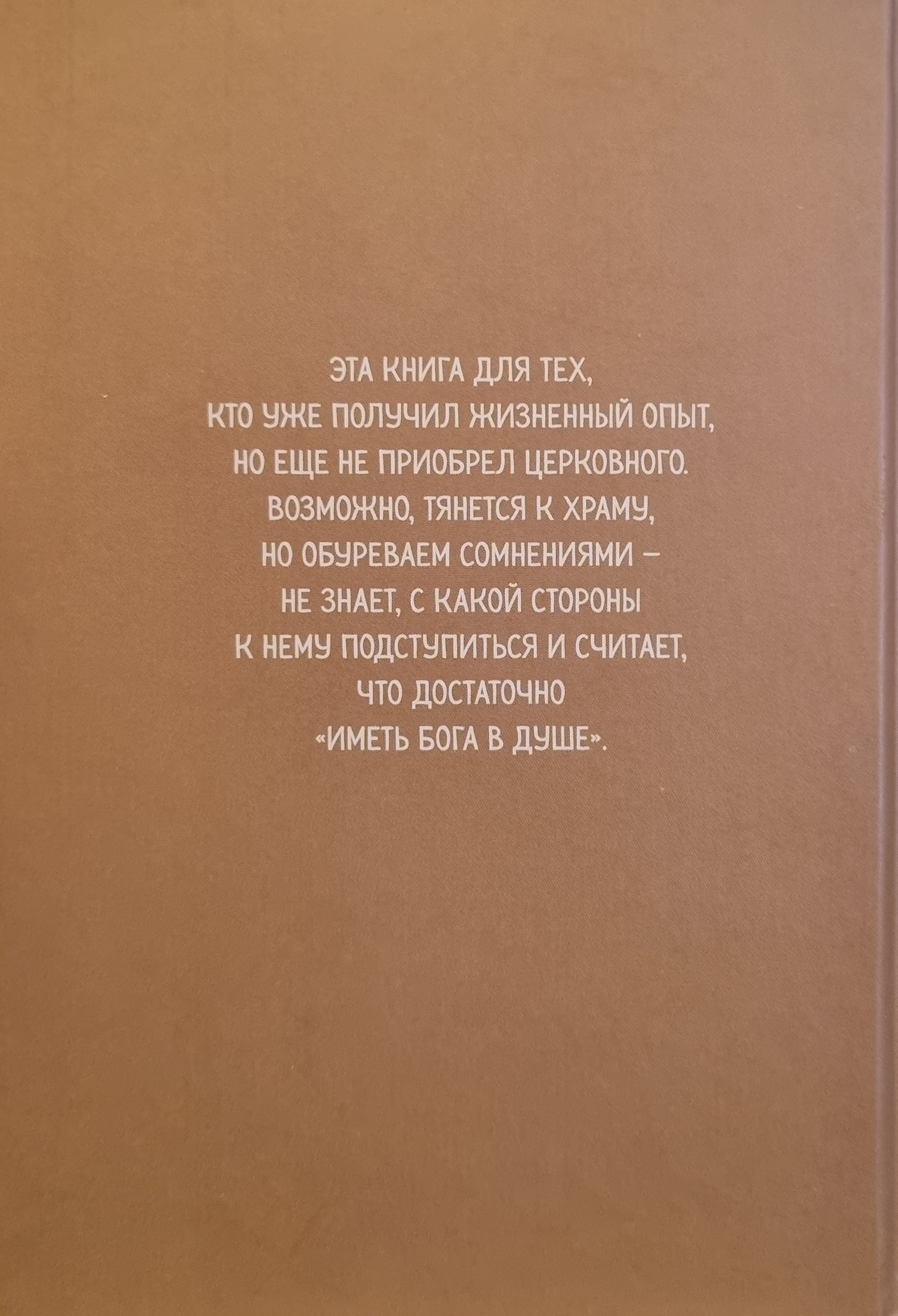 Эта книга для тех, кто уже получил жизненный опыт но еще не приобрел церковного. Возможно, тянется к храму, но обуреваем сомнениями не знает, с какой стороны к нему подступиться и считает, что достаточно иметь Бога в душе.