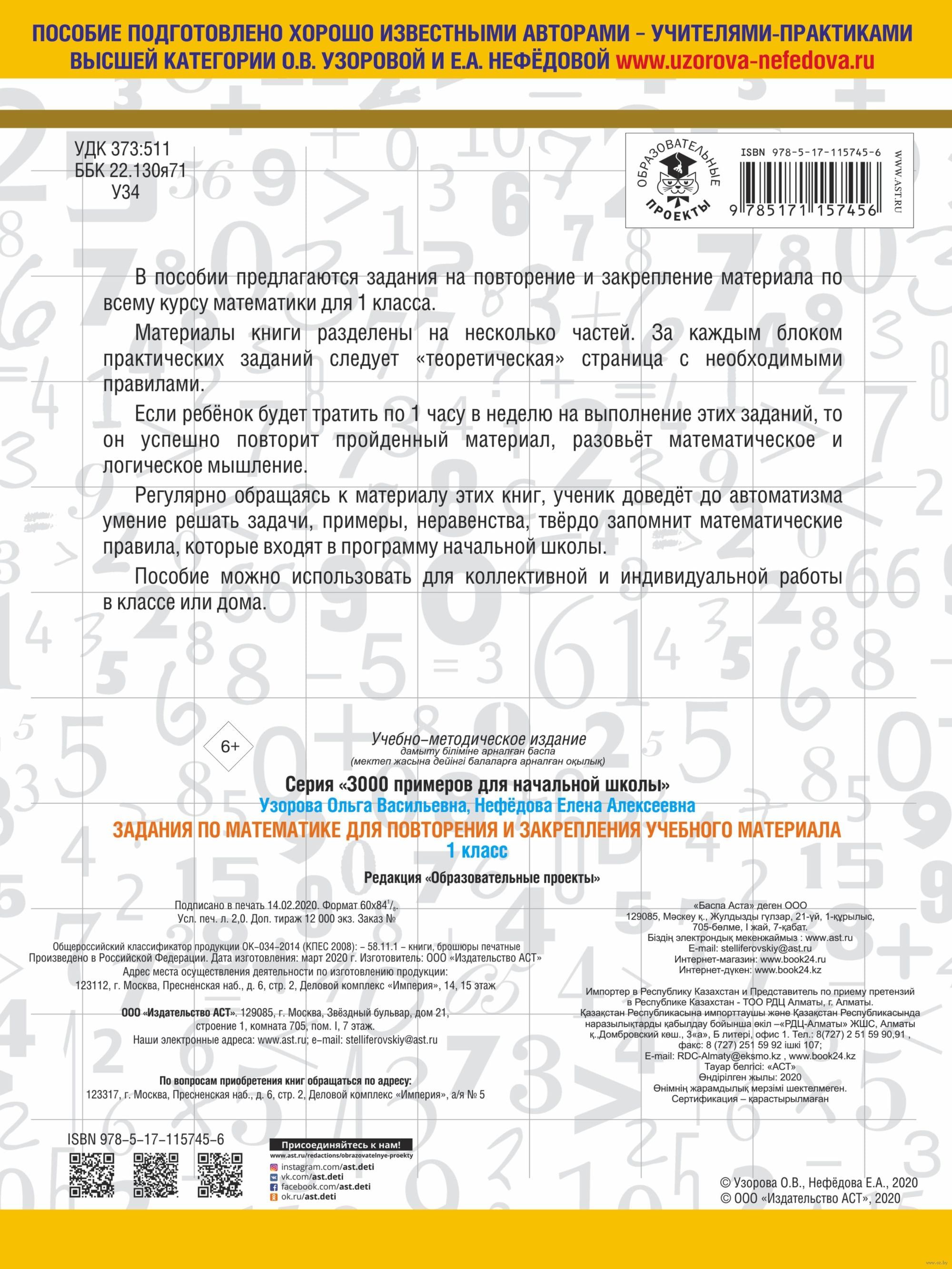 Материалы книги разделены на несколько частей. За каждым блоком практических заданий следует «теоретическая» страница с необходимыми правилами. Если ребёнок будет тратить по 1 часу в неделю на выполнение этих заданий, то он успешно повторит пройденный материал, разовьёт математическое и логическое мышление. Регулярно обращаясь к материалу этих книг, ученик доведёт до автоматизма умение решать задачи, примеры, неравенства, твёрдо запомнит математические правила, которые входят в программу начальной школы. Пособие можно использовать для коллективной и индивидуальной работы в классе или дома.