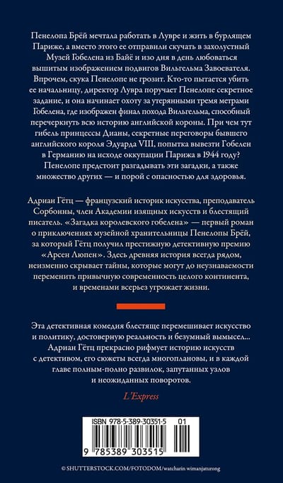 Адриан Гётц — известный французский историк искусства, преподаватель Сорбонны, член Академии изящных искусств, директор библиотеки Мармоттан при Академии и блестящий писатель. «Загадка королевского гобелена» — первый роман о приключениях музейной хранительницы Пенелопы Брёй, за который Гётц получил престижную детективную премию «Арсен Люпен» (2007). Здесь древняя история всегда рядом, неизменно скрывает тайны, которые могут до неузнаваемости переменить привычную современность целого континента, и временами всерьез угрожает жизни.