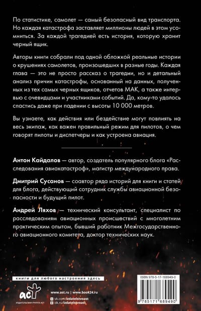 Антон Кайдалов — автор, создатель популярного блога «Расследования авиакатастроф», магистр международного права. Дмитрий Сусанов — соавтор ряда историй для книги и статей для блога, действующий сотрудник службы авиационной безопасности и будущий пилот.