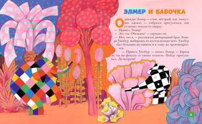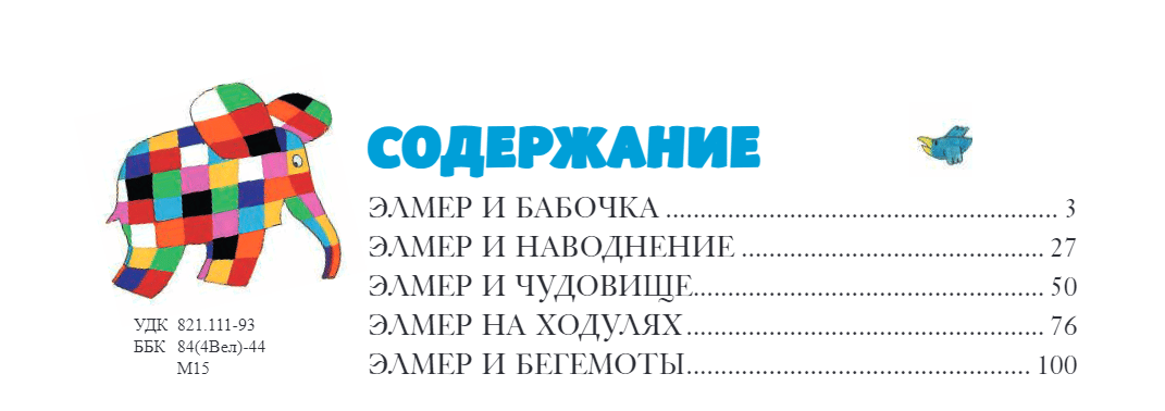 Пестрого слона Элмера и других слонов ждут захватывающие приключения! На джунгли надвигается множество напастей: стадо бегемотов, наводнение, охотники и неведомое чудовище. Но благодаря оптимизму Элмера, его невероятной изобретательности, храбрости и искренней доброте ни одна проблема жителям джунглей не страшна – Элмер придумает выход из любой ситуации! Ведь даже если маленькая бабочка может спасти большого слона, то всем слонам вместе под силу многое, хоть прогнать охотников из джунглей! Пестрый слон Элмер и истории про него вдохновляют читателей быть добрыми, смелыми и помогать другим.