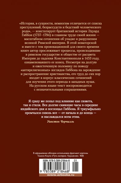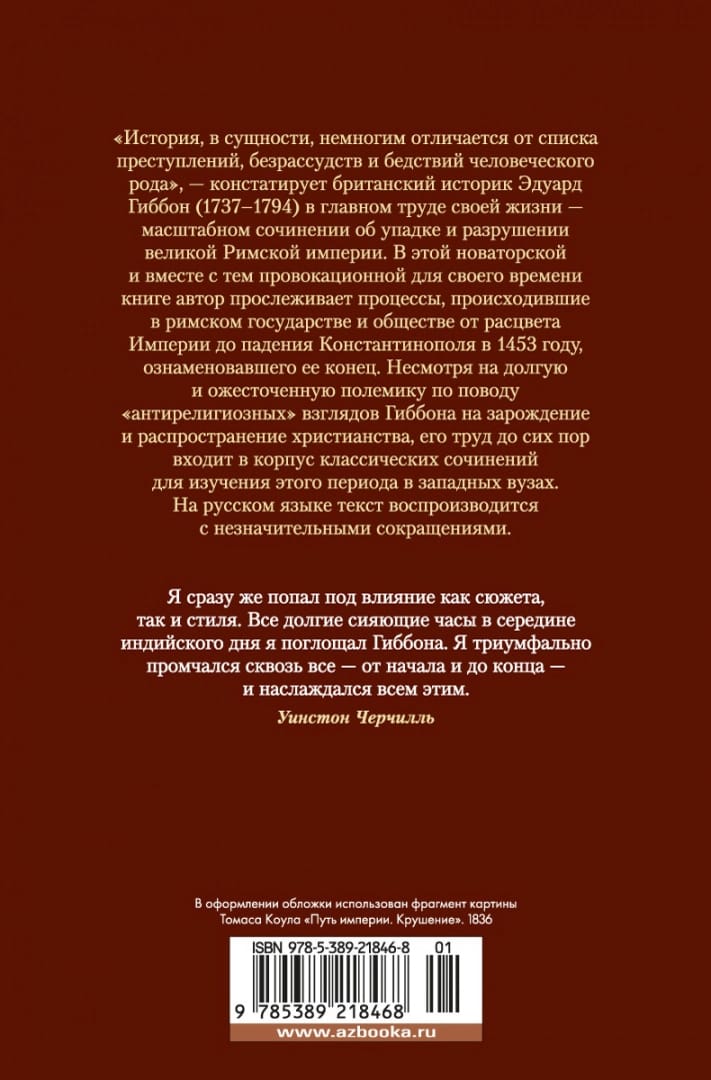 «История, в сущности, немногим отличается от списка преступлений, безрассудств и бедствий человеческого рода», — констатирует британский историк Эдуард Гиббон (1737–1794) в главном труде своей жизни — масштабном сочинении об упадке и разрушении великой Римской империи. В этой новаторской и вместе с тем провокационной для своего времени книге автор прослеживает процессы, происходившие в римском государстве и обществе от расцвета Империи до падения Константинополя в 1453 году, ознаменовавшего ее конец. Несмотря на долгую и ожесточенную полемику по поводу «антирелигиозных» взглядов Гиббона на зарождение и распространение христианства, его труд до сих пор входит в корпус классических сочинений для изучения этого периода в западных вузах. На русском языке текст воспроизводится с незначительными сокращениями.