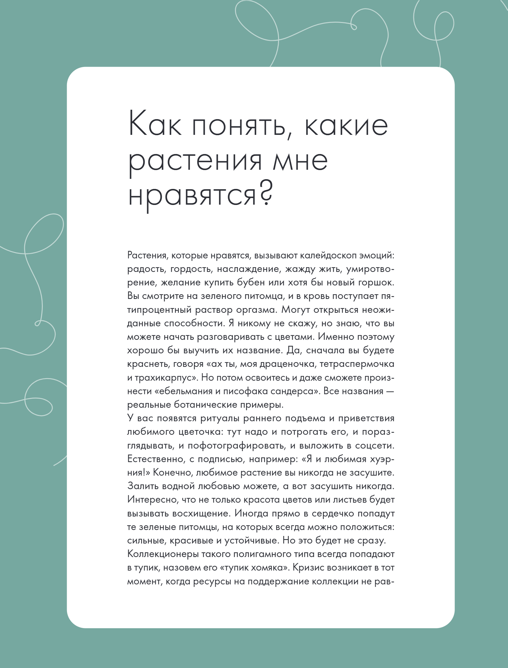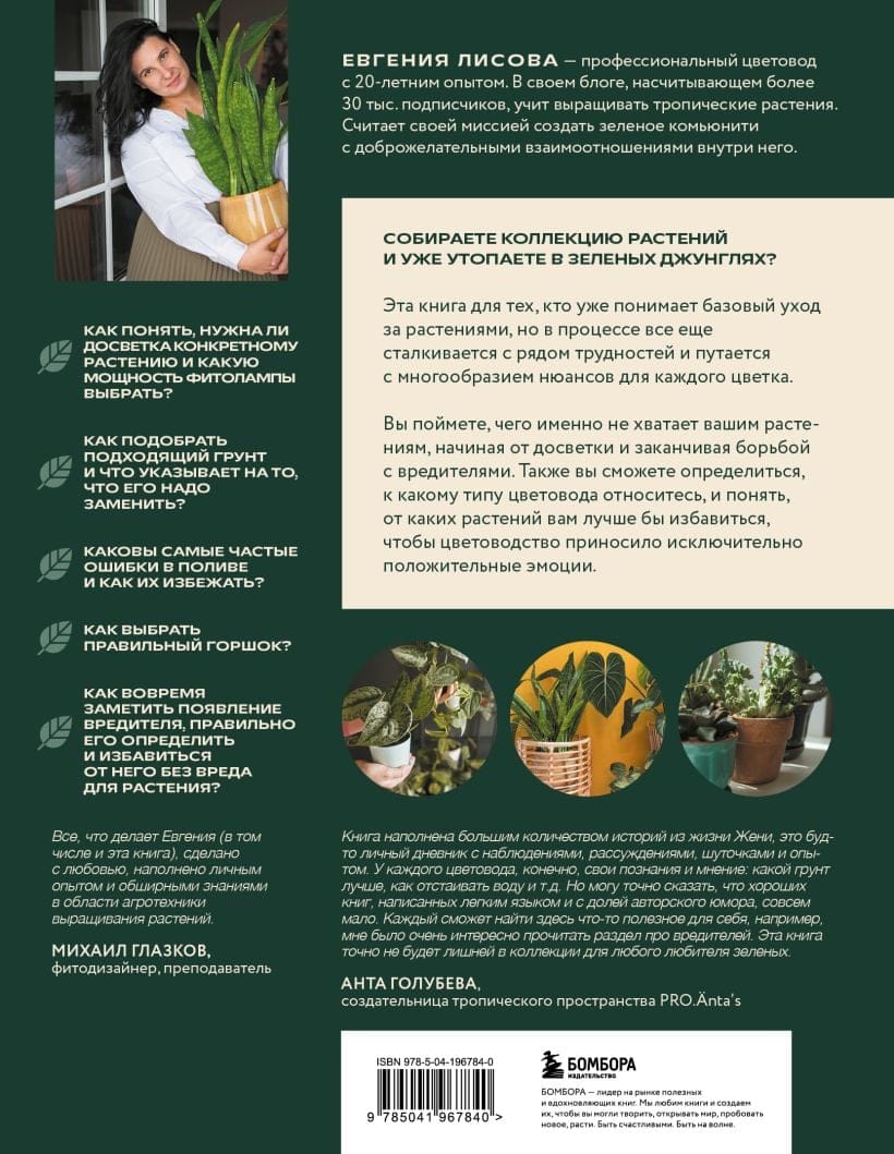 Эта книга для тех, кто уже понимает базовый уход за растениями, но в процессе все еще сталкивается с рядом трудностей и путается с многообразием нюансов для каждого цветка. Вы поймете, чего именно не хватает вашим растениям, начиная от досветки и заканчивая борьбой с вредителями. Также вы сможете определиться, к какому типу цветовода относитесь, и понять, от каких растений вам лучше бы избавиться, чтобы цветоводство приносило исключительно положительные эмоции. А секретные лайфхаки от профессионального цветовода Евгении Лисовой, написанные легким языком с долей юмора, обязательно помогут вам вырастить пышные кусты, которыми даже можно будет прикрыться в день голого цветовода!
