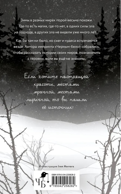 Зимы в разных мирах, порой, весьма похожи. Где-то есть магия, где-то нет, в одних силы зла на подходе, в других зла не видели уже много лет… Как бы там ни было, но снег и чудеса встречаются везде. Авторы импринта «Черным-бело» собрались, чтобы рассказать истории своих миров, познакомить с героями, если вы ещё не знакомы. Если хотите настоящей красоты, местами мрачной, местами лиричной, то вы нашли её источник!