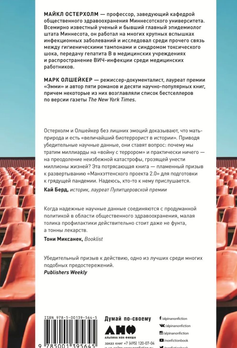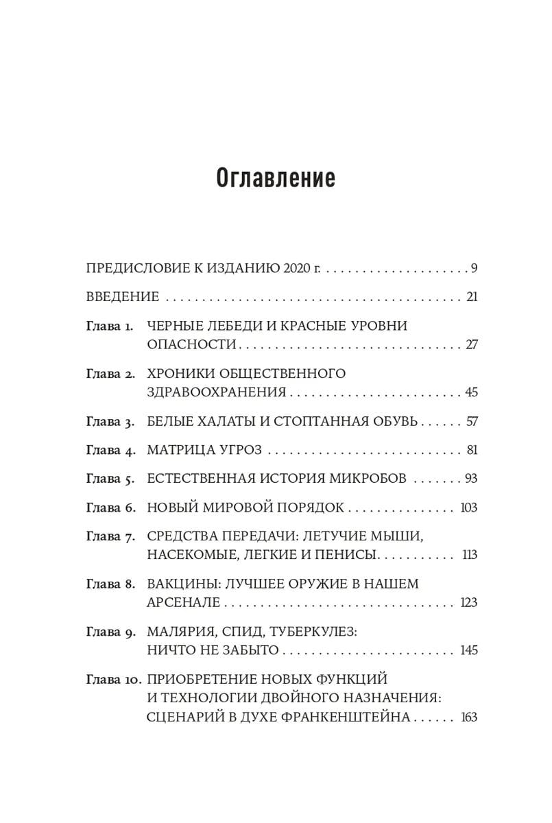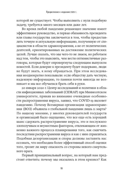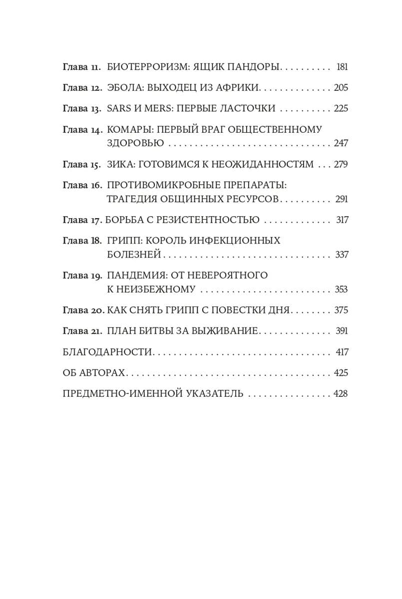 Авторы запланировали эту книгу во время эпидемии лихорадки Эбола в 2014–2016 гг., а писали ее во время вспышки лихорадки Зика. В процессе работы они не забыли об эпидемии коронавируса SARS 2002 г., вспышке гриппа H1N1 2009 г. и о MERS — коронавирусе 2012 г. Наконец, после всего этого мир столкнулся с пандемией COVID-19. А по заверениям авторов обязательно придет и следующая пандемия, а за ней еще и еще. Скорее всего, нас ждет новый вирус гриппа, не менее смертоносный, чем «испанка» 1918–1919 гг. Только эта пандемия будет разворачиваться в мире, где живет в три раза больше людей, где есть международные авиаперевозки и существуют мегаполисы третьего мира — готовые взорваться пороховые бочки. Книга призывает использовать кризис, вызванный COVID-19, как урок и основу для подготовки к будущим событиям, чтобы они не застали нас врасплох.