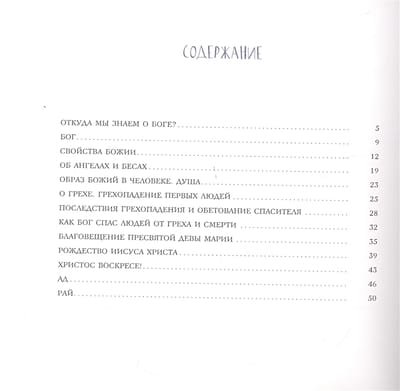 Книга «Закон Божий» даёт маленькому читателю первые ключевые знания о Боге, вере и религии. Она беседует с ним на простом и понятном языке, обращаясь к близким современному ребёнку образам и примерам. Эта книга не только изложение ветхозаветных и новозаветных событий и заповедей, но и беседа о том, чем на самом деле является Церковь, какие в ней совершаются таинства и обряды, для чего нужны пост и молитва. Ребёнок найдёт на её страницах объяснение таких непростых понятий и слов, как Бог, ад, рай, первородный грех, Евангелие, Святые Дары, Исповедь и Евхаристия, а ещё узнает, кого, кроме Бога, изображают на иконах. И сам текст, и необычные иллюстрации являются мостом, по которому ребёнок в будущем сможет прийти к осознанию глубоких и важных для каждого верующего человека истин.