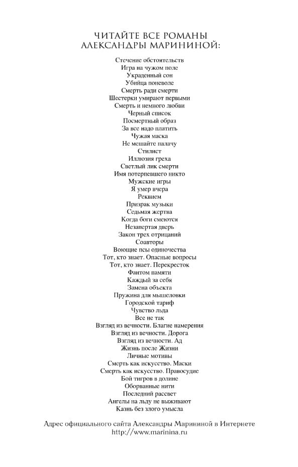 Насте Каменской не повезло — она попала в аварию. Скоро ее выпишут из госпиталя, но сломанная нога все болит и болит, так что Настя передвигается с большим трудом. Она решает обратиться к специалисту, использующему нетрадиционные методы лечения. Но когда Настя звонит по нужному телефону, выясняется, что этот специалист убит. А тут еще одна неприятность. После госпиталя Насте негде жить: ее квартира занята неожиданно нагрянувшими родственниками. Так Настя оказывается на даче у знакомого, где совершает лечебные прогулки и развлекает себя обсуждением с коллегами подробностей очередного громкого убийства молодой кинозвезды. И вдруг она с ужасом обнаруживает, что за ней кто-то следит…
