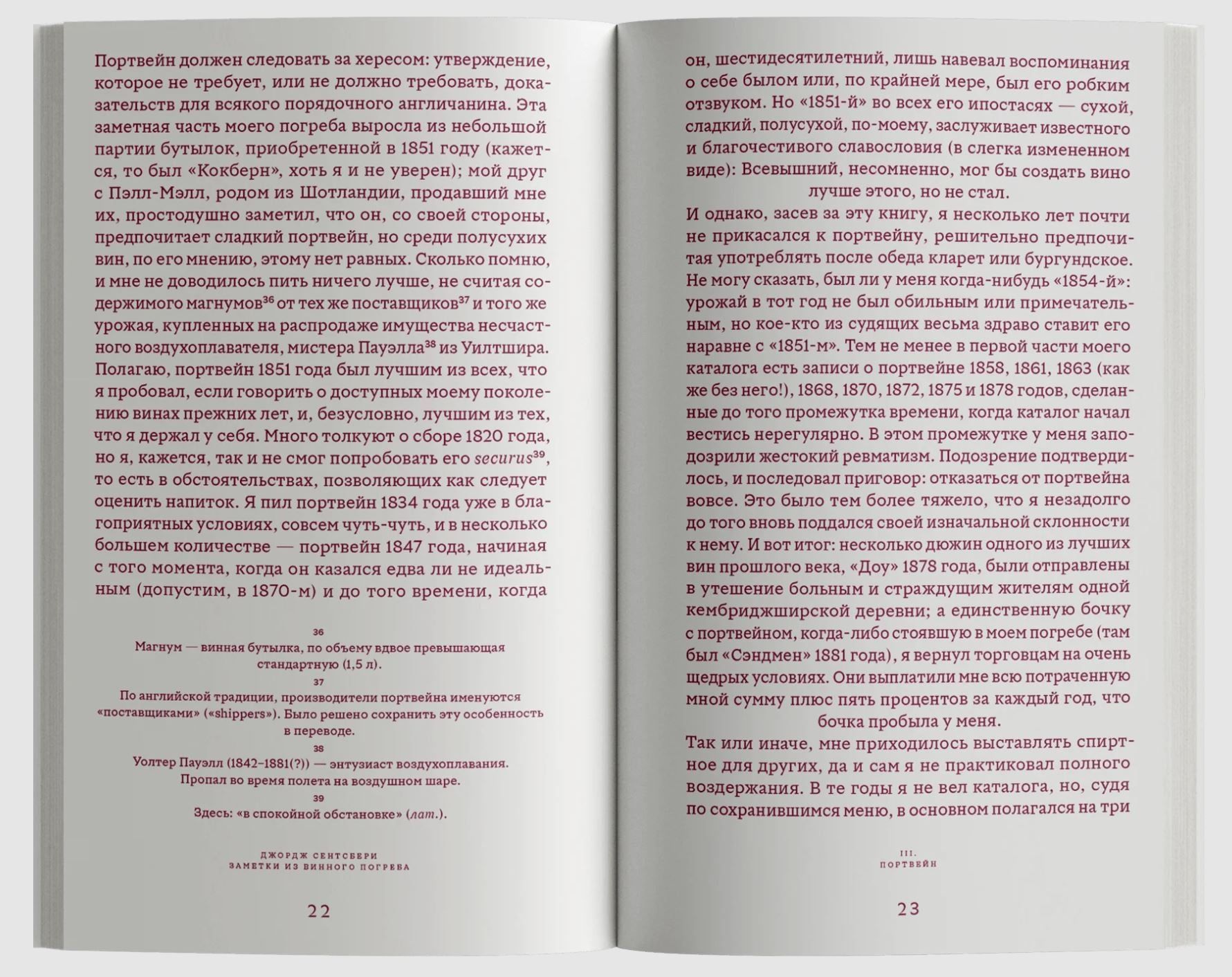 Английский филолог и литературный критик Джордж Сентсбери (1845–1933) прославился книгой о спиртных напитках. «Заметки из винного погреба» (1920) — описание собранной им коллекции и энциклопедия алкоголя, доступного в Великобритании второй половины ХIХ века. Сентсбери подробно рассказывает о достоинствах и недостатках, традициях употребления, особенностях приготовления и хранения хереса и мадеры, портвейна и виски, кларета и шампанского, бургундского, рейнского и мозельского вин, сидров, пива и т. д. Как истинный гурман и литературовед, Сентсбери не только сравнивает напитки между собой, но и приводит упоминания о них в мировой литературе. Любовь к хорошим книгам и пристрастие к хорошему вину, по мнению автора, дополняют друг друга и являются качествами, отличающими истинного джентльмена.
