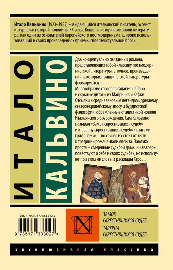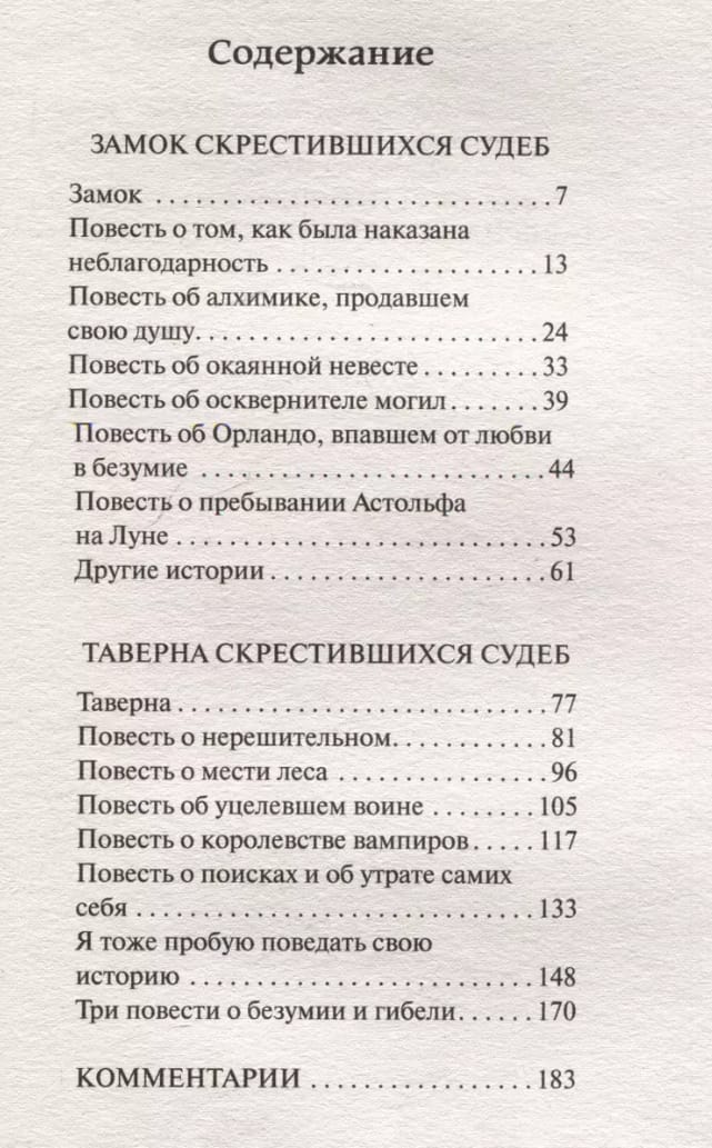 Многообразие способов гадания на Таро и скрытые цитаты из Майринка и Кафки. Отсылки к средневековым легендам, древнему североевропейскому эпосу и буддистской философии, обрамленные стилистикой новелл Итальянского Возрождения. Сам Кальвино называл «‎Замок скрестившихся судеб»‎ и «‎Таверну скрестившихся судеб»‎ «‎книгами-грифонами»‎ - но сейчас их стоит отнести к традиции романа-палимпсеста. Завязка проста - сведенные судьбой дамы и кавалеры повествуют о себе и своих судьбах, но используют при этом не слова, а расклады Таро…