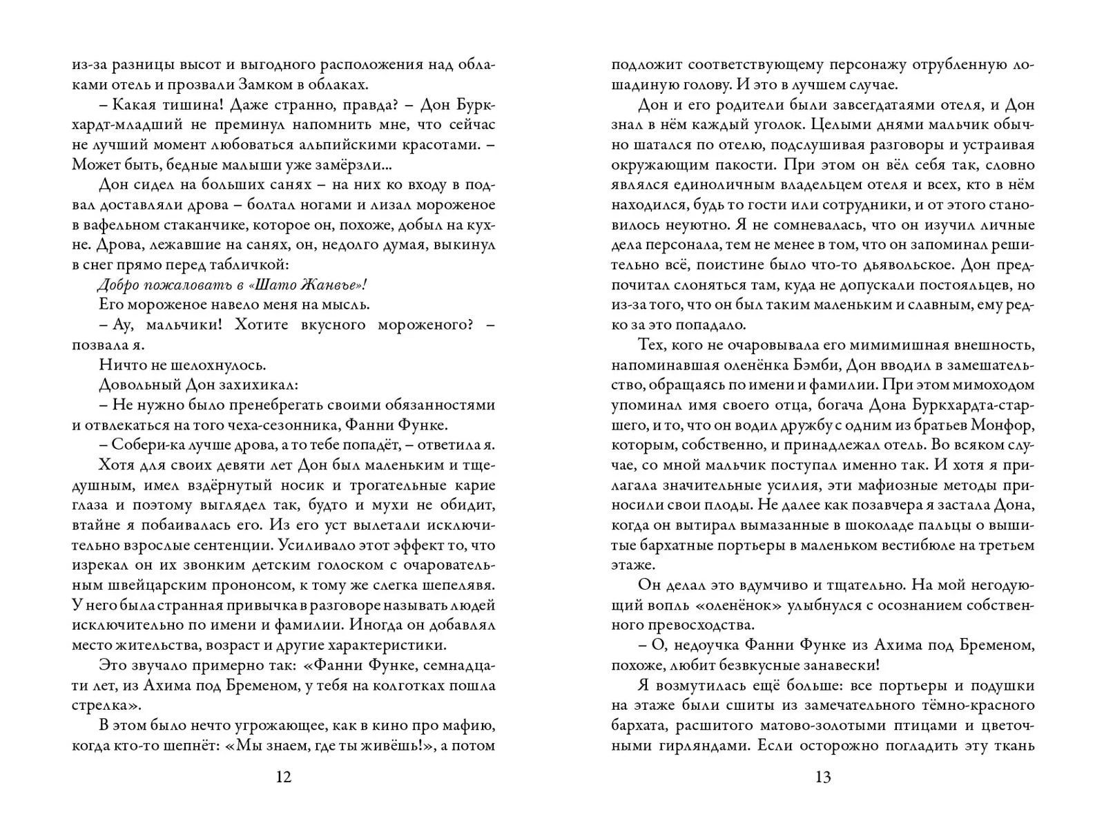 Фанни Функе считает себя неудачницей: школу не окончила, с родителями поссорилась и фактически сбежала из дома, поступив на годовую практику в старинный швейцарский отель «Шато Жанвье», который все называют Замком в облаках. Под Новый год в отеле яблоку негде упасть: сюда съехались сливки общества, в том числе семья загадочного русского олигарха, американский денежный мешок с многочисленными родственниками и специалист по драгоценным камням из Лондона, которого сопровождает обаятельный внук с замашками грабителя. Что привело их сюда? Действительно ли они те, за кого себя выдают? И главное – кому из них можно доверять? Пытаясь выяснить это, Фанни оказывается в эпицентре невероятных событий... Детектив накладывается в книге на историю о Золушке в современных реалиях,а главная героиня смотрит на происходящее с присущим ей чувством юмора и здравым смыслом.