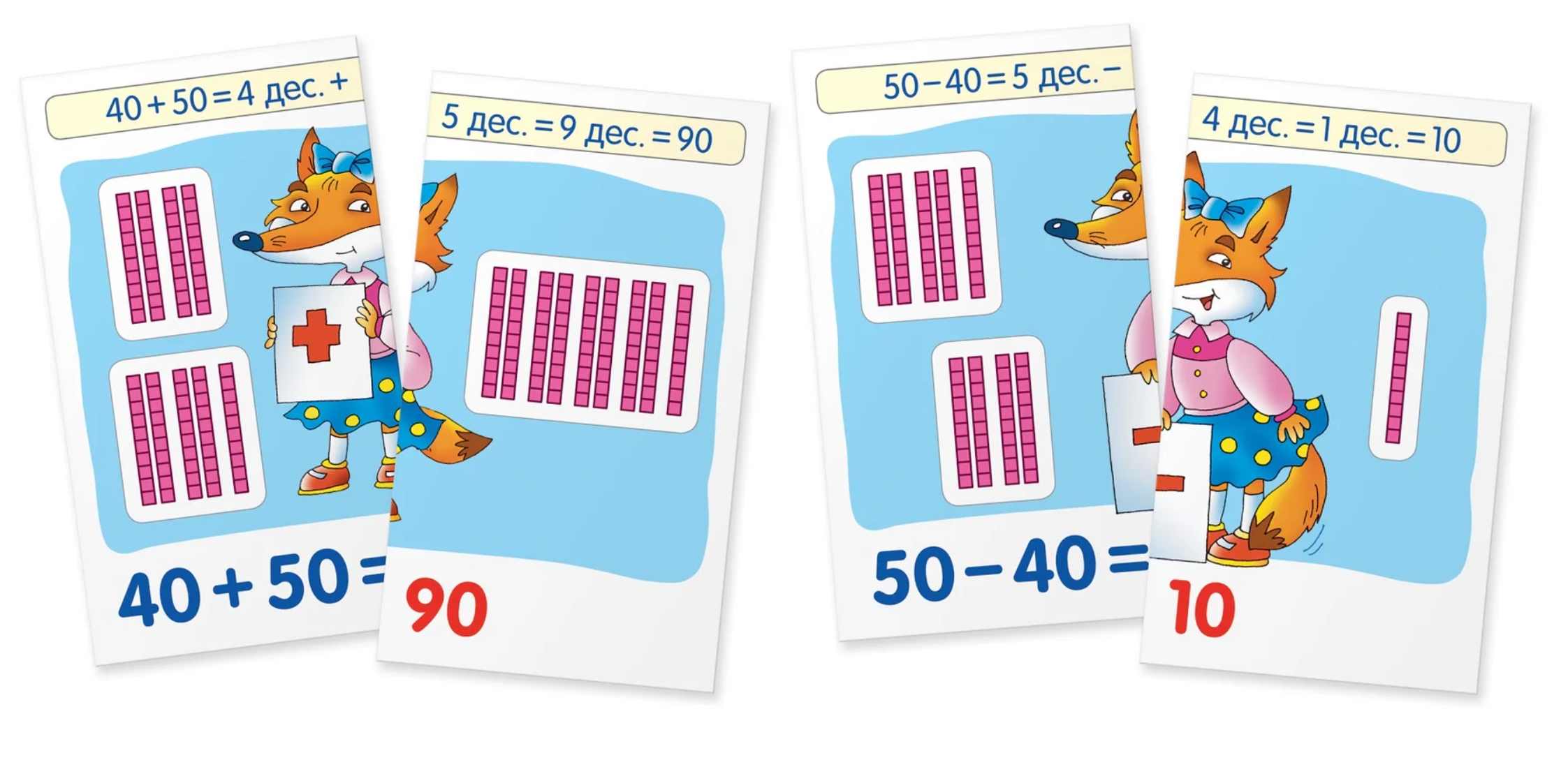Набор карточек, который поможет научить ребёнка складывать, вычитать и сравнивать числа в пределах 100. Играя, малыш познакомится с разрядами и классами чисел, запомнит основные арифметические правила. Задания созданы по специальной методике, которая не только помогает научиться считать, но и рождает у ребёнка интерес к математике, стремление использовать математические знания в повседневной жизни.