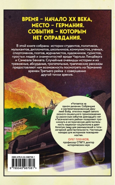 В книге собраны истории студентов, политиков, музыкантов, дипломатов, школьников, коммунистов, ученых, спортсменов, поэтов, журналистов, художников, туристов, простых людей и знаменитостей вроде Чарльза Линдберга и Сэмюэла Беккета. Случайные очевидцы истории и их тревожные, абсурдные, трогательные, трагические рассказы предоставляют нам возможность посмотреть на Германию времен Третьего Рейха с совершенно другой точки обзора.