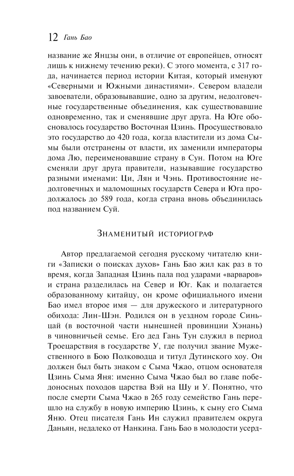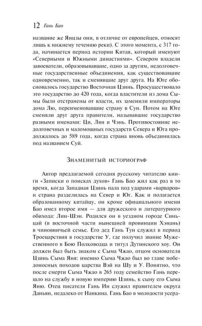 Книга знаменитого литератора Гань Бао «Записки о поисках духов» — один из древнейших и наиболее известных памятников китайской литературы, повествующий о том, «о чем не говорил Конфуций», — о разнообразнейшей нечисти: о духах гор, рек, лесов и их проделках, об отшельниках, оборотнях и чудотворцах. Гань Бао задумал свою книгу как доказательство существования духов. «Записки о поисках духов» остались в веках как наиболее универсальный и всеобъемлющий сборник фантастических рассказов, сюжеты которых используются в китайской литературе вплоть до нашего времени.