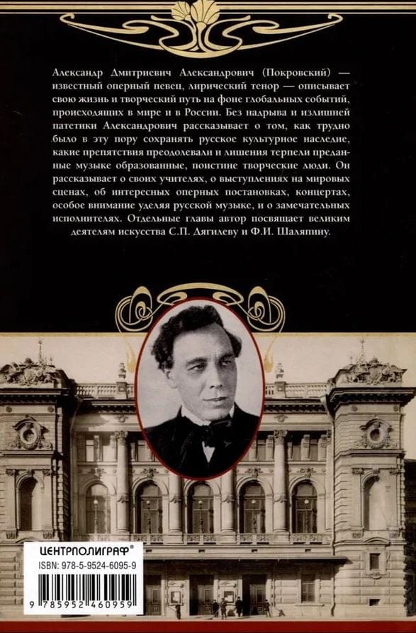 Александр Дмитриевич Александрович (Покровский) — известный оперный певец, лирический тенор — описывает свою жизнь и творческий путь на фоне глобальных событий, происходящих в мире и в России. Без надрыва и излишней патетики Александрович рассказывает о том, как трудно было в эту пору сохранять русское культурное наследие, какие препятствия преодолевали и лишения терпели преданные музыке образованные, поистине творческие люди. Он рассказывает о своих учителях, о выступлениях на мировых сценах, об интересных оперных постановках, концертах, особое внимание уделяя русской музыке, и о замечательных исполнителях. Отдельные главы автор посвящает великим деятелям искусства С.П. Дягилеву и Ф.И. Шаляпину.