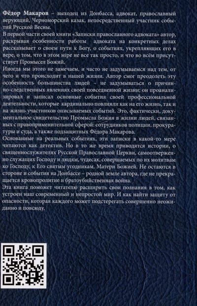 Федор Макаров – выходец из Донбасса, адвокат, православный верующий. В первой части своей книги «Записки православного адвоката» он, раскрывая особенности работы адвоката на конкретных делах, рассказывает о своем пути к Богу, о событиях, укрепляющих его в вере, о том, что в этом мире не все так просто и что во всём присутствует Промысел Божий.