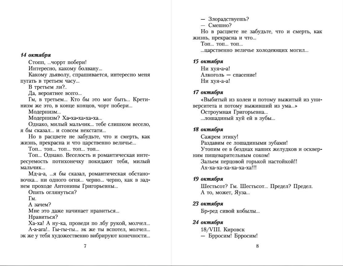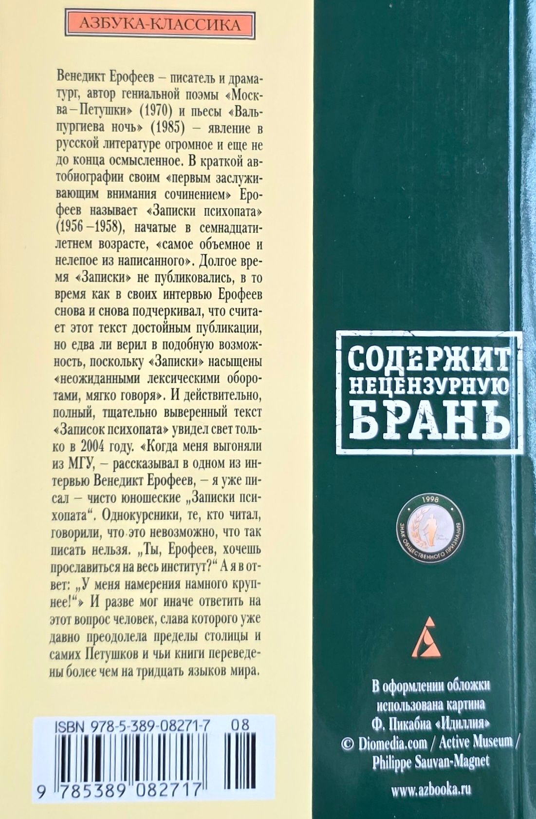 Венедикт Ерофеев — писатель и драматург, автор гениальной поэмы «Москва—Петушки» (1970) и пьесы «Вальпургиева ночь» (1985) — явление в русской литературе огромное и еще не до конца осмысленное. В краткой автобиографии своим «первым заслуживающим внимания сочинением» Ерофеев называет «Записки психопата» (1956–1958), начатые в семнадцатилетнем возрасте, «самое объемное и нелепое из написанного».