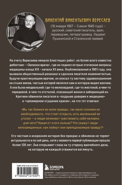 Эти слова принадлежат выдающемуся русскому литератору, писателю, переводчику и врачу — Викентию Вересаеву. Его литературный дебют «Записки врача» начинается с «признания» в собственном несовершенстве, и в этом вся прелесть этой книги. Она полна признаний в бессилии и надежд на успех, описаний врачебных ошибок и чудесных спасений. Автор рассуждает о том, что нужно врачу для того, чтобы вести успешную практику, как пережить неизбежные фатальные ошибки, совершенные вследствие нехватки опыта или несовершенства средств диагностики того времени, говорит о незавидном положении простых людей, не имеющих средств на оплату платного приема и становящихся «пособием» для студентов медицинских институтов. Все это делает «Записки врача» уникально честной летописью врачебного дела в России конца XIX 一 начала XX века.