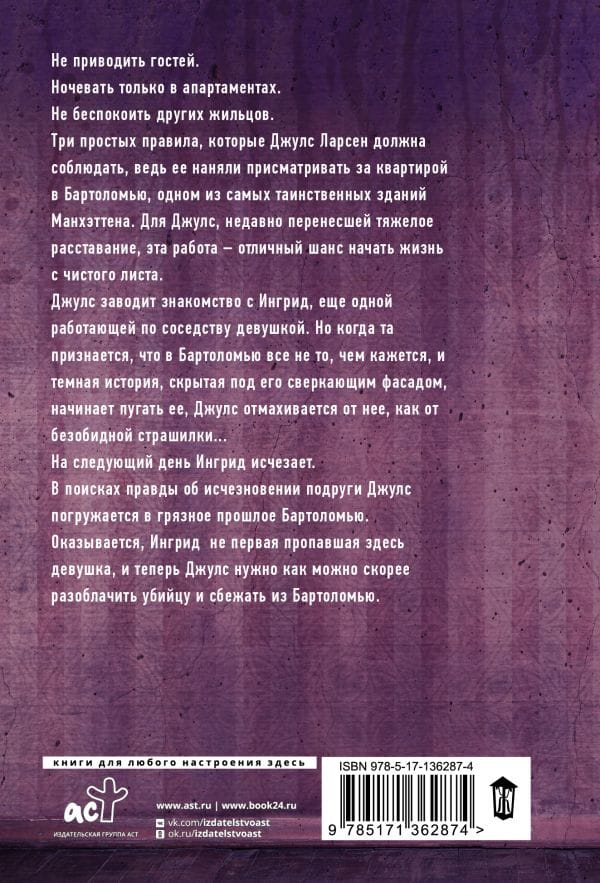 Кто же не хочет жить в огромной квартире идеального дома в шикарном районе, с идеальной обстановкой и знаменитыми соседями? Согласились бы вы пожить в таком доме при условии, что вам ещё и заплатят за это двенадцать тысяч долларов? В таких условиях можно даже закрыть глаза на очень странные и подозрительные правила «работодателя»... Джулс — обычная девушка, и, кажется, она движется по бесконечной черной полосе жизни: родители погибли, сестра пропала без вести, молодой человек изменил, и, как на зло, денег осталось совсем мало. А ютиться в маленькой квартирке подруги и чувствовать себя лишней Джулс тоже не очень хочет. Поэтому девушка без лишних вопросов соглашается на привлекательное предложение пожить в квартире ее мечты. В той, о которой она читала в своей любимой книге. Только вот, обустроившись в идеальном Бартоломью, девушка замечает, что там происходят жуткие вещи. И что ей делать, когда ее соседка Ингрид, также подозревающая неладное, вдруг неожиданно пропадает?