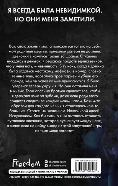 Но они оставляют меня в живых. Трое опасных братьев сделают все, чтобы я держала язык за зубами, даже если ради этого придется следить за каждым моим шагом. Каким-то образом для каждого из них я становлюсь чем-то большим. Страстным желанием. Навязчивой идеей. Искушением. Как бы сильно я ни пыталась отрицать пугающее влечение, которое пульсирует между нами, я знаю: если не найду выход из этой запутанной игры, их тьма меня поглотит.