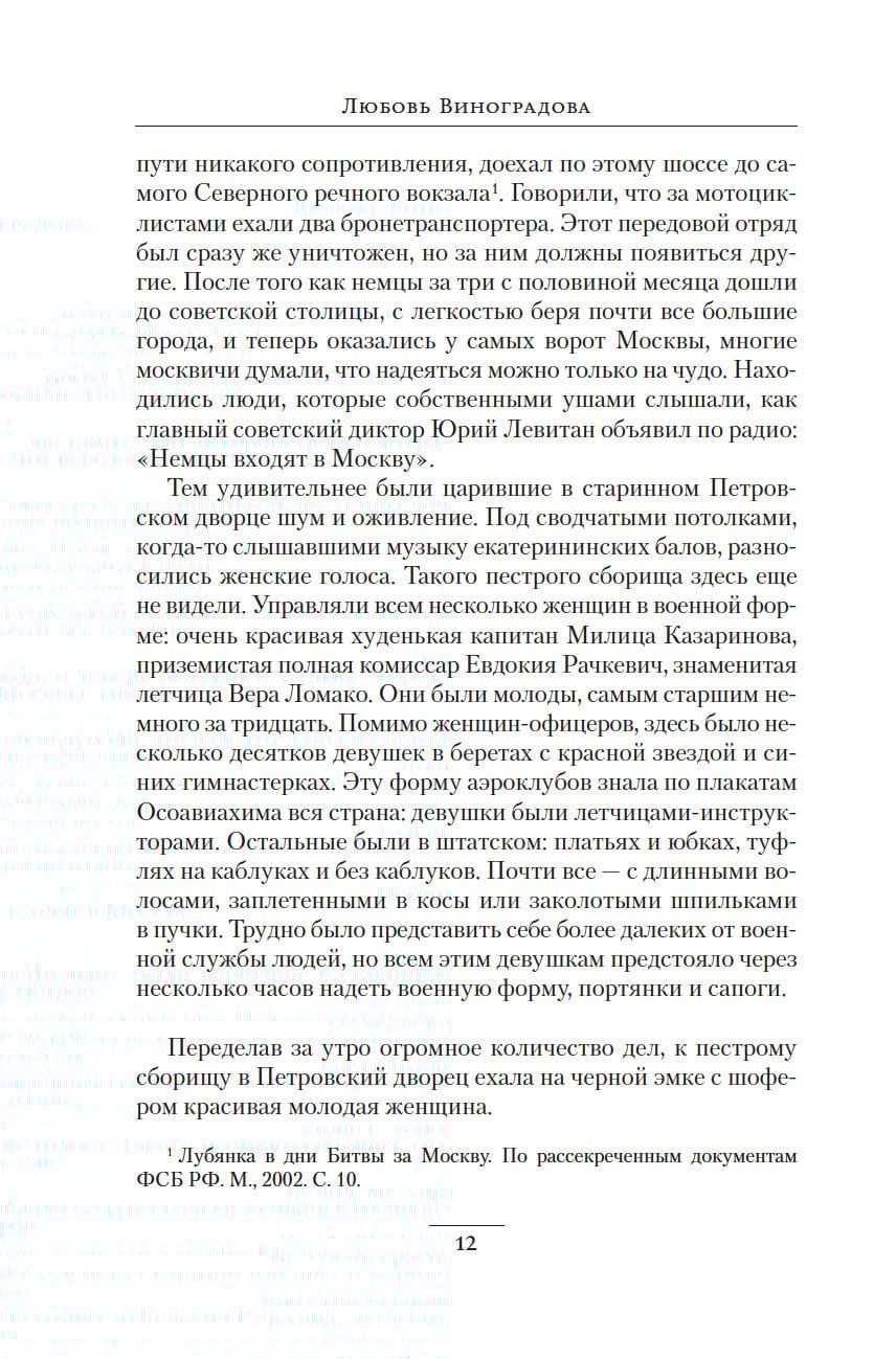 В созданной легендарной советской летчицей Мариной Расковой «Авиачасти № 122» не было мужчин. Все ее воины — летчики, штурманы, техники — вчерашние студентки, работницы фабрик и заводов, воспитанницы аэроклубов, которые встали в строй и прошли долгую дорогу войны до дня Великой Победы. Исследователь Любовь Виноградова работала в архивах, изучала мемуары очевидцев, встречалась с участниками событий и членами их семей. Результатом этого кропотливого труда явилась уникальная историко-документальная книга, в которой детально, с любовью и горечью рассказывается об удивительных девушках, главным событием в жизни которых стала война. У многих героинь книги судьба была короткой и трагической. Свои жизни они отдали за Родину, которую любили и сумели спасти.
