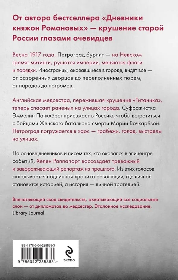 Опираясь на забытые архивы и малоизвестные свидетельства, Хелен Раппапорт соединяет десятки голосов в единое повествование — тревожное, пронзительное и живое. Это репортаж из прошлого, где каждый очевидец видит свой кусочек катастрофы, а все вместе они складывают панораму гибнущей империи.