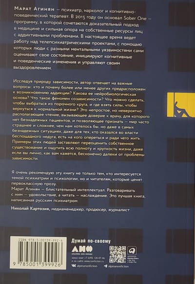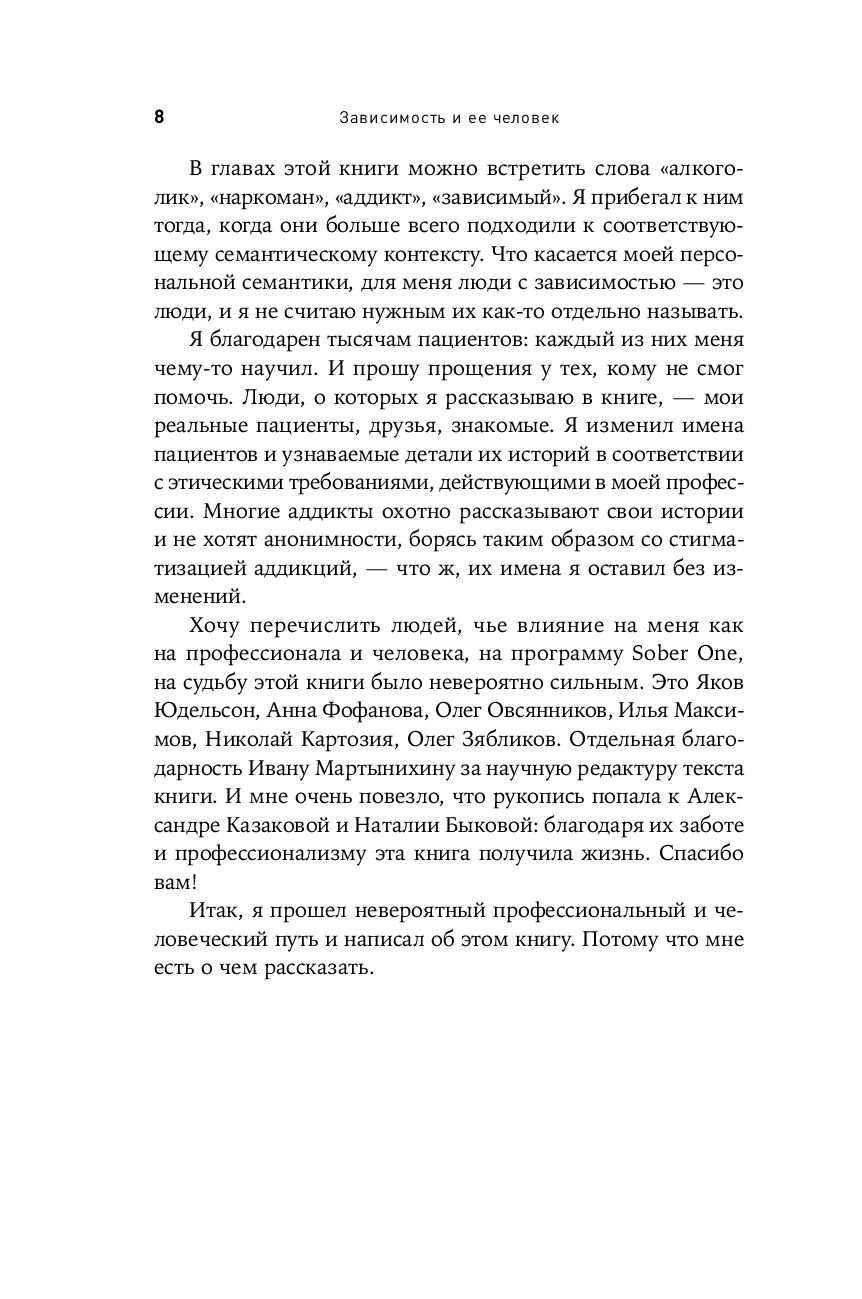 По мнению автора, недуг преодолевают не те, кто обладает исключительным интеллектом или железной волей, а те, кто каждый день, шаг за шагом, делает то, что положено делать. В книге «Зависимость и ее человек» автор рассказывает реальные истории людей, дошедших до самого дна и сломавших не только свою, но и чужие жизни. Не всем им удалось выжить и спастись, но тем ценнее опыт тех, кто вопреки всему смог преодолеть зависимость и выйти на путь уверенного выздоровления.