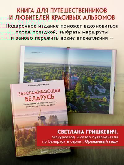 Подарочное издание «Завораживающая Беларусь. Путешествие по уголкам страны, которые остаются в сердце» — это возможность вновь пережить яркие впечатления от поездки или вдохновиться на новое путешествие. Светлана Гришкевич, экскурсовод и автор путеводителя по Беларуси в серии «Оранжевый гид», собрала в книге самые красивые и знаковые места страны.