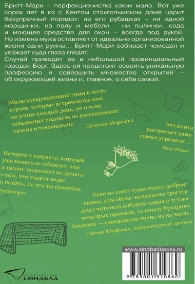 Но весь порядок рушится в одно мгновение, когда Бритт-Мари узнает, что Кент, с которым они сорок лет прожили в образцовом браке, изменил ей. Она принимает удивительное для самой себя решение — собрать чемодан и уехать куда глаза глядят. В захолустном провинциальном городишке с не очень приветливым населением Бритт-Мари придется налаживать новую жизнь. Которая окажется совершенно непохожей на прежнюю.