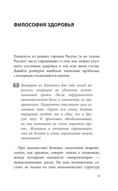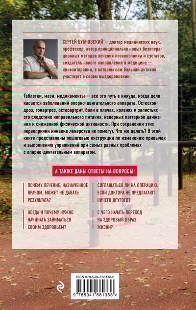 Новая книга доктора Бубновского рассказывает, как работает человеческий организм, когда он может давать сбой и почему лекарства, убирающие симптомы, на самом деле не справляются с первопричиной заболевания. Даже очевидно эффективные процедуры, к примеру, хирургические манипуляции, могут нанести больше вреда, чем пользы, если после оперативного вмешательства не восстанавливать свое тело с помощью физических упражнений.
