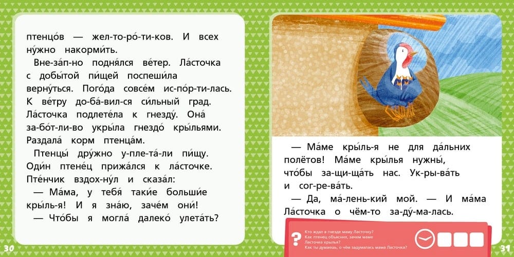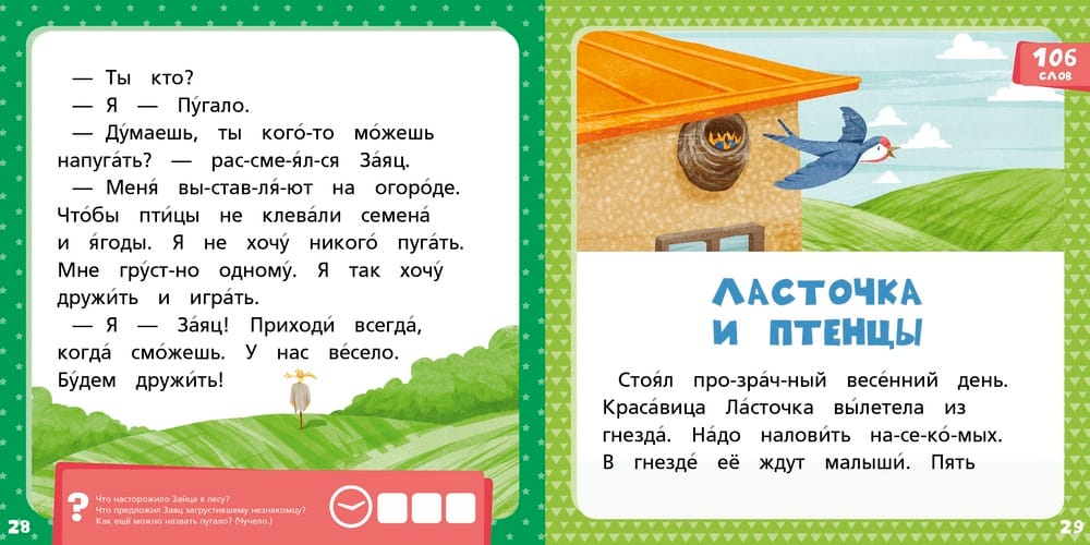 3 фишки книги: - возраст 4–7 лет. - родители смогут сами научить ребенка читать. - уникальный тест на проверку скорости чтения. Книга из весенней коллекции Clever "Растем вместе". Михаил Носов составил эту книгу по методике, которая работает уже 25 лет и доказала: учиться читать может быть легко и интересно. Эта книга — сборник коротких сказок. Ребенок, который учится читать, не успеет устать, утомиться. Плюс ко всему — сюжет каждой сказки увлекает, малышу захочется узнать, что будет дальше. В обучении чтению важны не только крупный шрифт, разделение на слоги и проставленные ударения в словах (хотя все это, конечно, есть в книге). Главное, не торопиться и не ждать быстрых результатов. Все получится, если родители наберутся терпения и будут подбадривать и хвалить своего ребенка. В серии три книги: "Оранжевая", "Синяя" и "Зеленая". "Зеленая книга" — для тех, кто уже узнает буквы, складывает их в слоги. С "Зеленой книгой сказок" юный читатель научится складывать слоги в слова, а слова — в предложения. Чему учит эта книга: - читать по слогам. - правильно ставить ударения в словах. - видеть слово. - понимать прочитанное - складывать слова в предложения. Об авторе: Михаил Носов — известный методист, воспитатель и просто дедушка. Он разработал такую систему обучения чтению, которая понравится детям. Ребенок не устанет, потому что сказки короткие. Он увлечется, потому что сказки интересные и волшебные. Михаил Носов придумал самый простой и веселый способ захотеть научиться читать. Гид для родителей: Для мам и пап в книге есть пошаговая инструкция, как заниматься с ребенком. Ваша задача — быть внимательным слушателем. А еще вы можете поиграть в театр с волшебными персонажами сказок. Обсудите сюжет, пусть малыш подумает и скажет, почему герои сказок поступали именно так. Сами, с помощью теста, вы можете проверить свое чадо на скорость чтения в любой момент. Это очень пригодится в школе.