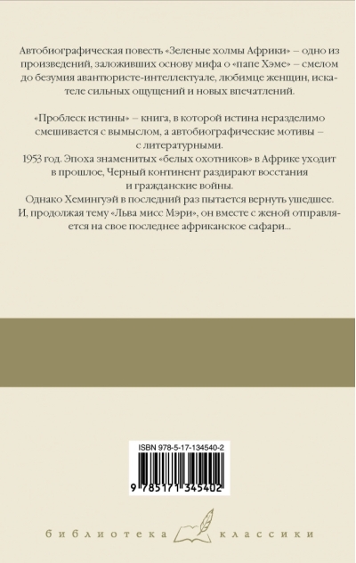 Автобиографическая повесть "Зеленые холмы Африки" – одно из произведений, заложивших основу мифа о "папе Хэме" – смелом до безумия авантюристе-интеллектуале, любимце женщин, искателе сильных ощущений и новых впечатлений.