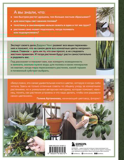Вы знали, что полив зависит от количества солнечного света, которое получает растение? Можете ли вы обеспечить столько света, сколько ему необходимо для выживания и процветания? Эксперт своего дела Дэррил Ченг развеет все ваши переживания и покажет, что на самом деле все комнатные цветы неприхотливые. Главное, дать им то, что они просят, а не следовать жестким правилам. И тогда растения будут расти самостоятельно и радовать вас. В конце книги вас ждет «Дневник домашних растений», где автор подробно описал свой опыт выращивания 20 комнатных цветов, за которыми наблюдал в течение нескольких месяцев. Он поможет вам посмотреть, как развивается растение при правильном уходе. Если вы оцените естественные условия вашего дома и в соответствии с ними подберете методы ухода за растениями, большинство проблем исчезнут. Вы станете ценить то, что дарит вам природа, и будете получать огромное удовольствие от своих растений в течение многих лет.