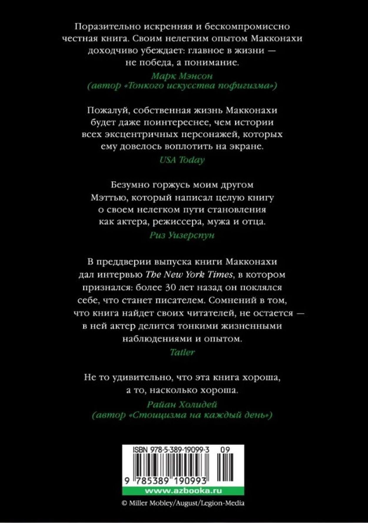 Одно из главных книжных событий 2020 года, «Зеленый свет» знаменитого Мэттью Макконахи (лауреат «Оскара» за главную мужскую роль в фильме «Далласский клуб покупателей», Раст Коул в сериале «Настоящий детектив», Микки Пирсон в «Джентльменах» Гая Риччи) — отчасти иллюстрированная автобиография, отчасти учебник жизни.