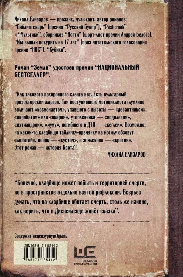 Михаил Елизаров — автор романов “Библиотекарь” (премия “Русский Букер"), “Pasternak” и “Мультики” (шорт-лист премии “Национальный бестселлер”), сборников рассказов “Ногти” (шорт-лист премии Андрея Белого), “Мы вышли покурить на 17 лет” (приз читательского голосования премии “НОС”).