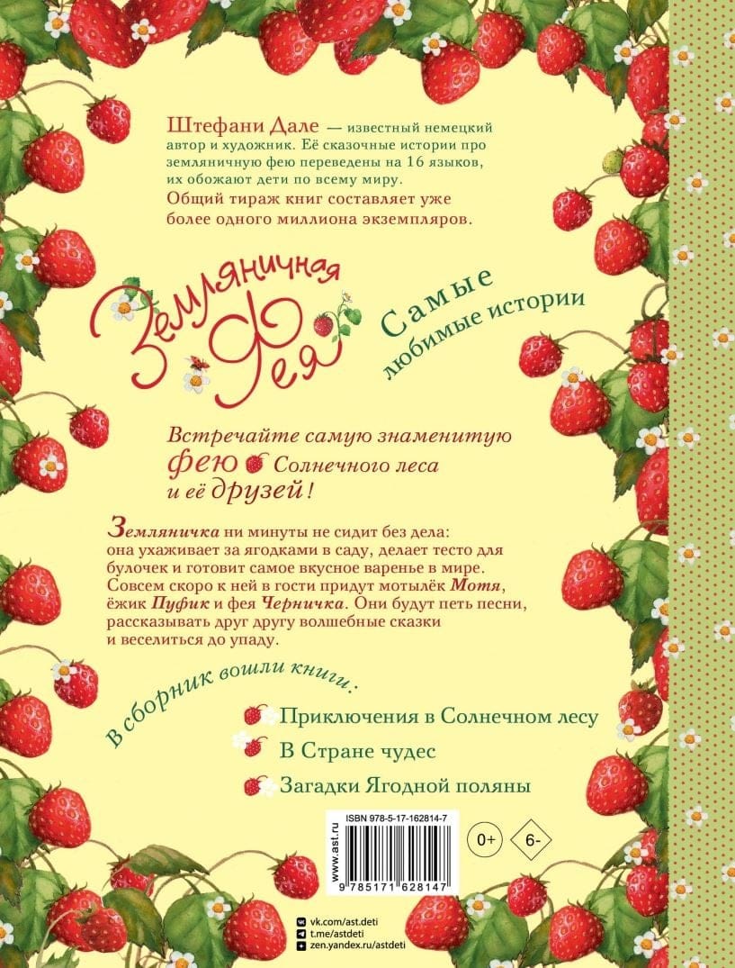 Земляничка ни минуты не сидит без дела: она ухаживает за ягодками в своём саду, делает тесто на пироги и готовит самый ароматный джем в мире. Ведь совсем скоро к ней в гости придут мотылёк Мотя, ёжик Пуфик, феи Черничка и Ежевичка. Они будут петь песни, рассказывать друг другу волшебные сказки и веселиться до упаду. Автор и иллюстратор Штефани Дале с детства любила рисовать и выдумывать интересные сюжеты для будущих сказок. Серия книг про Земляничку переведена на 16 языков мира, а тираж превышает уже 1 миллион экземпляров.