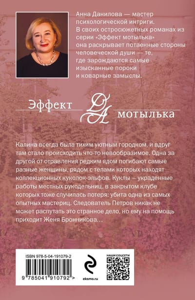 Калина всегда была тихим уютным городком, и вдруг там стало происходить что-то невообразимое. Одна за другой от отравления редким ядом погибают самые разные женщины, рядом с телами которых находят коллекционных куколок-эльфов. Куклы — украденные работы местных рукодельниц, в закрытом клубе которых тоже случилась потеря: убита одна из самых опытных мастериц. Следователь Петров никак не может распутать это странное дело, но ему на помощь приходит Женя Бронникова… Анна Данилова — профессиональный писатель, работает в разных жанрах (сюрреализм, реалистическая проза, детские повести, драматургия), на ее счету несколько пьес, сценариев. Но большая часть произведений написана в жанре психологического детектива. Книги автора были изданы во многих российских издательствах, а также переведены на болгарский и турецкие языки и изданы в Софии и Стамбуле.