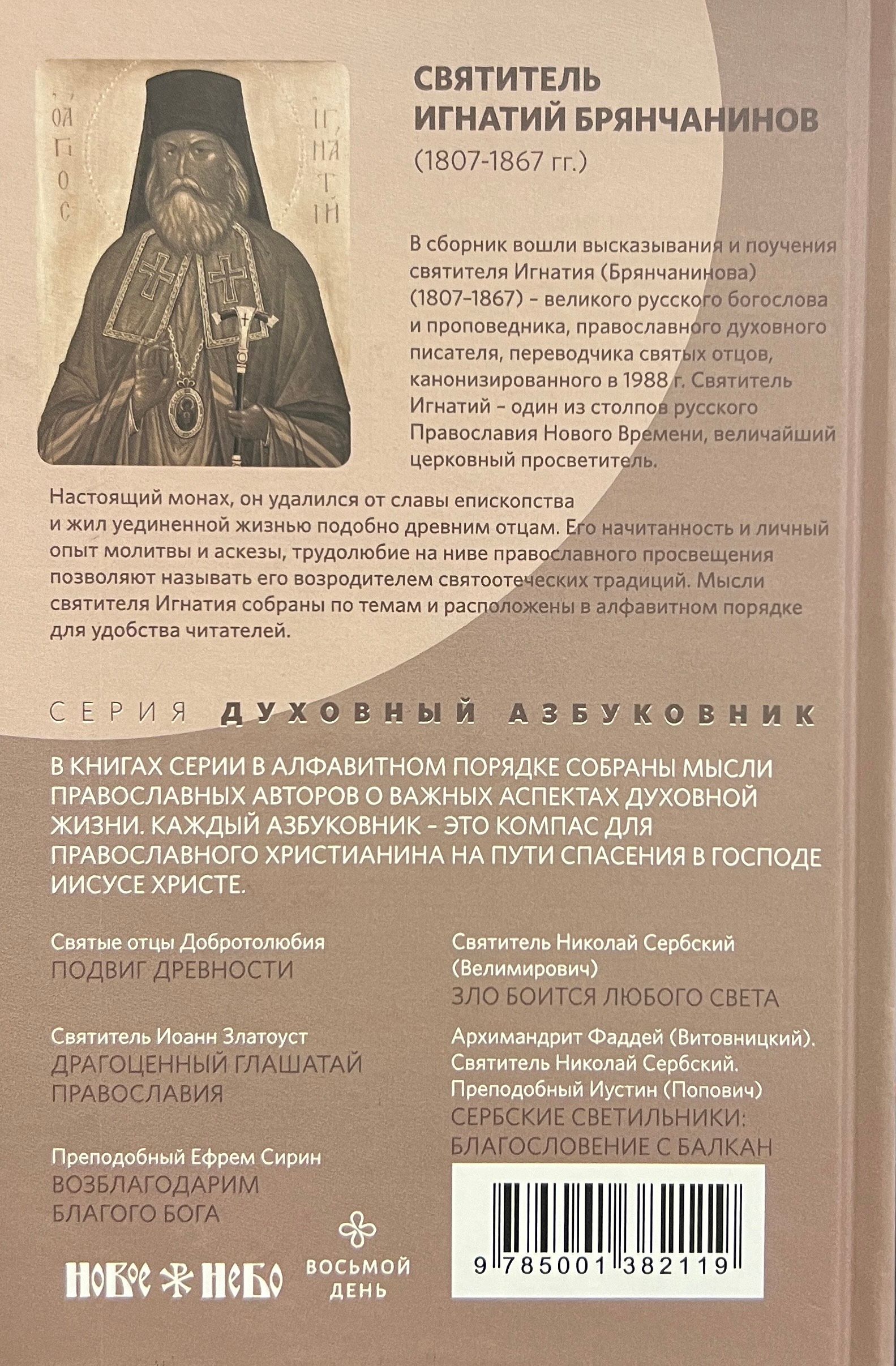 В сборник вошли высказывания и поучения святителя Игнатия (Брянчанинова) (1807–1867) – великого русского богослова и проповедника, православного духовного писателя, переводчика святых отцов, канонизированного в 1988 г. Святитель Игнатий – один из столпов русского Православия Нового Времени, величайший церковный просветитель. Настоящий монах, он удалился от славы епископства и жил уединенной жизнью подобно древним отцам. Его начитанность и личный опыт молитвы и аскезы, трудолюбие на ниве православного просвещения позволяют называть его возродителем святоотеческих традиций. Мысли святителя Игнатия собраны по темам и расположены в алфавитном порядке для удобства читателей.
